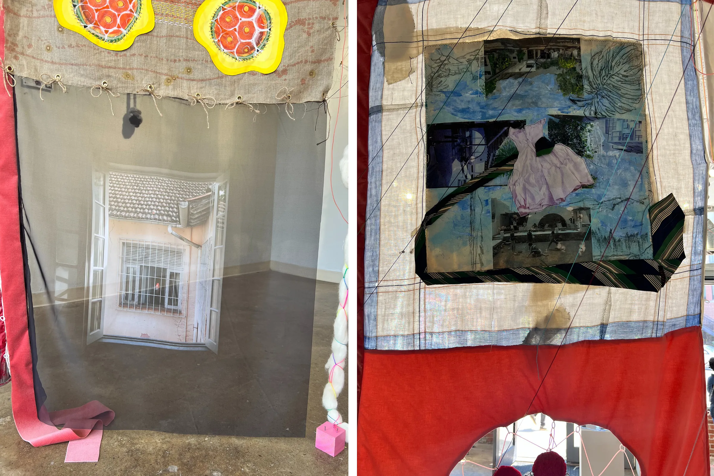 The concept of home and its diverse meanings is supported by the range of materials used in the quilt. Artists within the collective employed collage, used mixed-media sculptural strategies, or looked to photography to communicate what home means to them. Positioned in the lower left side of the quilt is a digital photograph on fabric titled Te Amo Mamãe (2024), by Carol Chediak (Rio de Janeiro, Brazil). The photograph shows an interior scene of an apartment taken through an opened window of another apartment just outside. The piece is printed on translucent material, letting light through the fibers and further illuminating the domestic space. It’s an image one can imagine seeing many times a day while making coffee or traversing your house. It’s not a beautiful scene, but one that most of us have in our homes, a space that we gaze at every day and become familiar with over time, providing a sense of security in its mundane sameness.