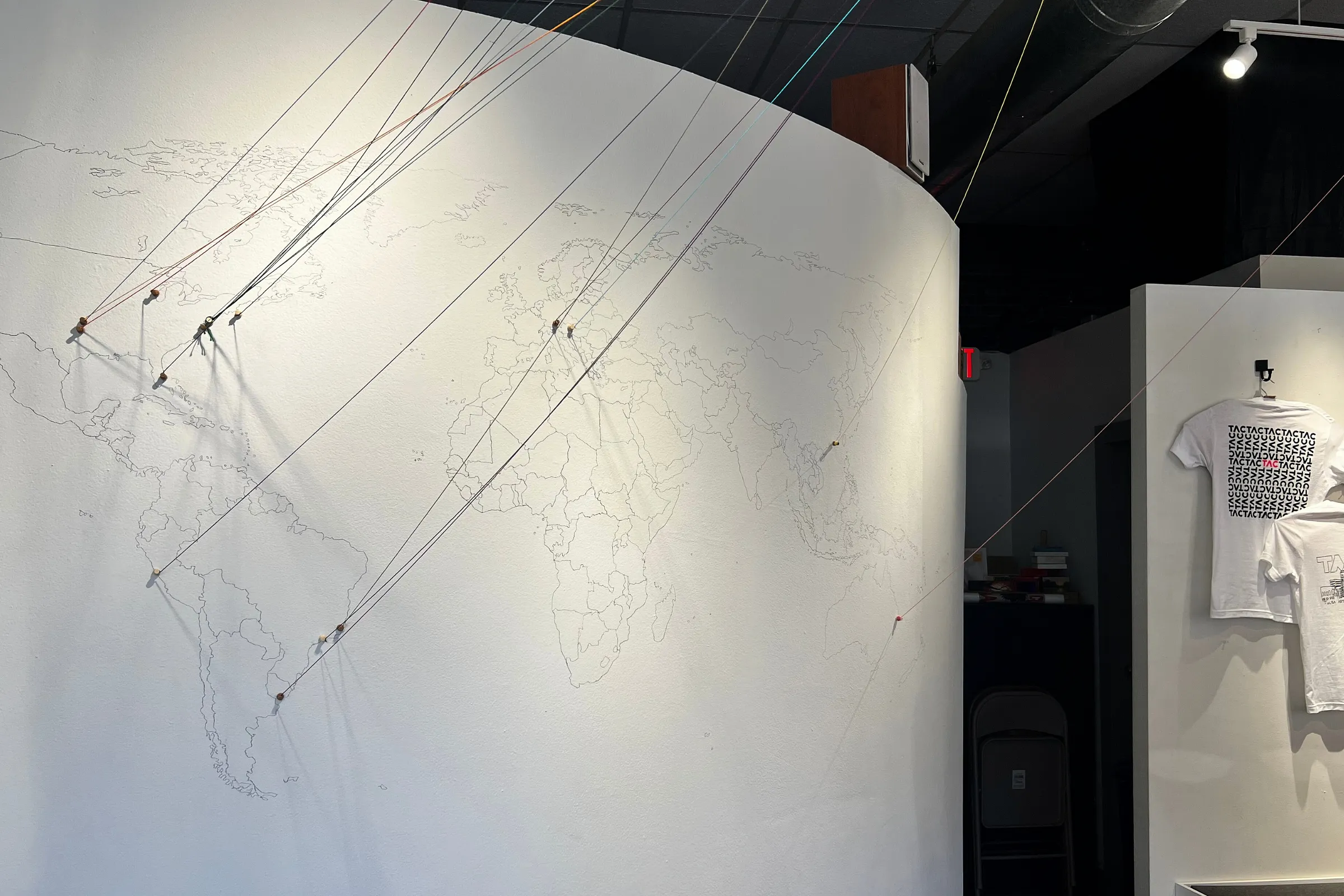Based in sites around the world, including Asia, South America, Europe and the United States, each artist made an individual square or piece, all of which were ultimately sewn together to form a large-scale quilt. The final piece hangs from the ceiling of TAC, centered within the space, taking up most of the gallery. Directly behind it is a map of the world with strings that connect each artist’s home country to their piece within the quilt. Hanging on the gallery walls are pieces by the participating artists that relate to their square within the larger work.