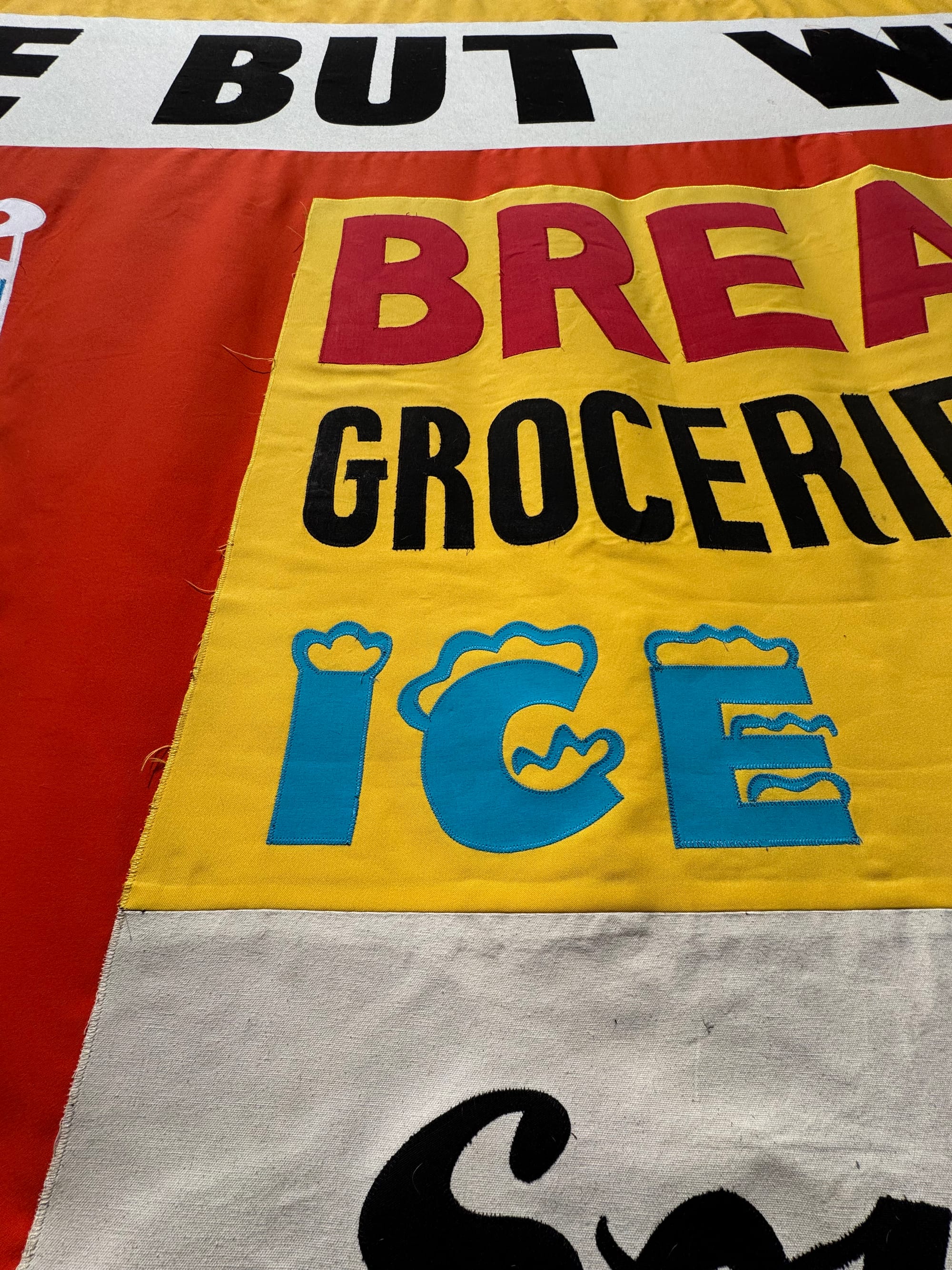 Price’s work does the same, weaving in references to shops like Discount Candles & Blessings and Busy Bee Hardware. “FOOD 4 THOUGHT” is stitched along the top, a nod to Eastern Market’s legacy of connecting Detroiters to fresh foods direct from farmers in a city that’s often dubbed a grocery store desert.