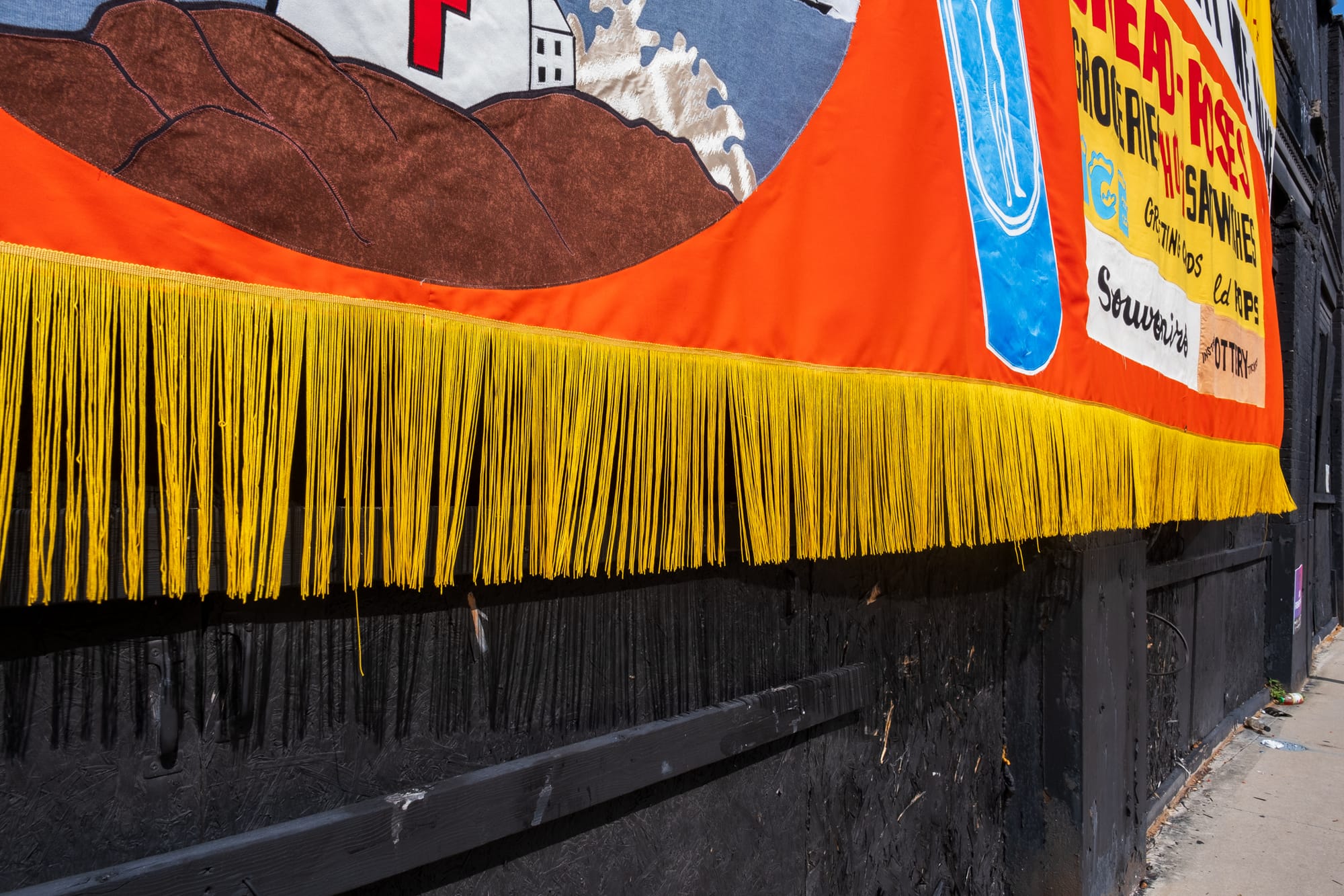 Clocking in at 24” feet by 12” feet, it’s on the larger size of Price’s work and complete with the signature tassels along the bottom. Even the way the wind makes these tassels dance and has the textile gently slapping against the brick building it calls home is an exciting sense of movement for the acclaimed public art festival.