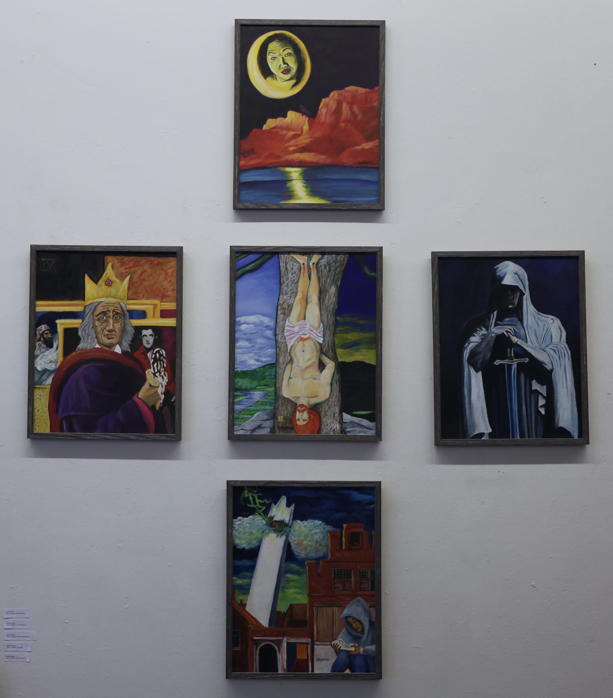 The tarot deck proves irresistible to a number of artists in the show, for great reason: it has a parade of images ripe for depiction and reinterpretation, and why not layer even more meaning into a deck already full of centuries of readings? Donald Brown plays his hand with a series of five paintings that combine the mysterious with a sense of sly humor; it wouldn't be surprising if a reading from these cards were a little tongue in cheek. Lys Guillorn's deck of collage cards, with no text around them at all, offers a similar sense of play. The juxtaposed images on the cards offer a sense of friction and interpretation while offering no particular direction for that interpretation to go. Perhaps it's up to the one using the deck to decide their own fate.
