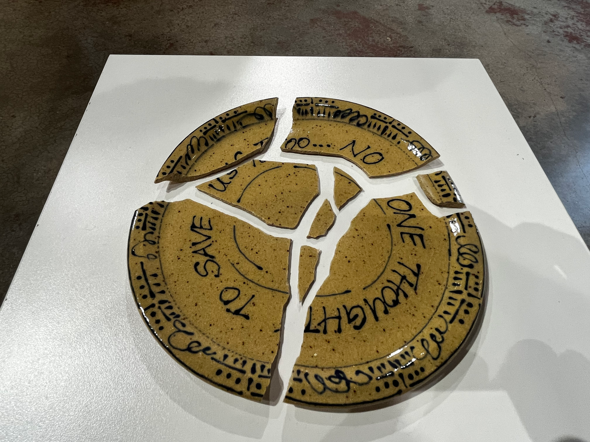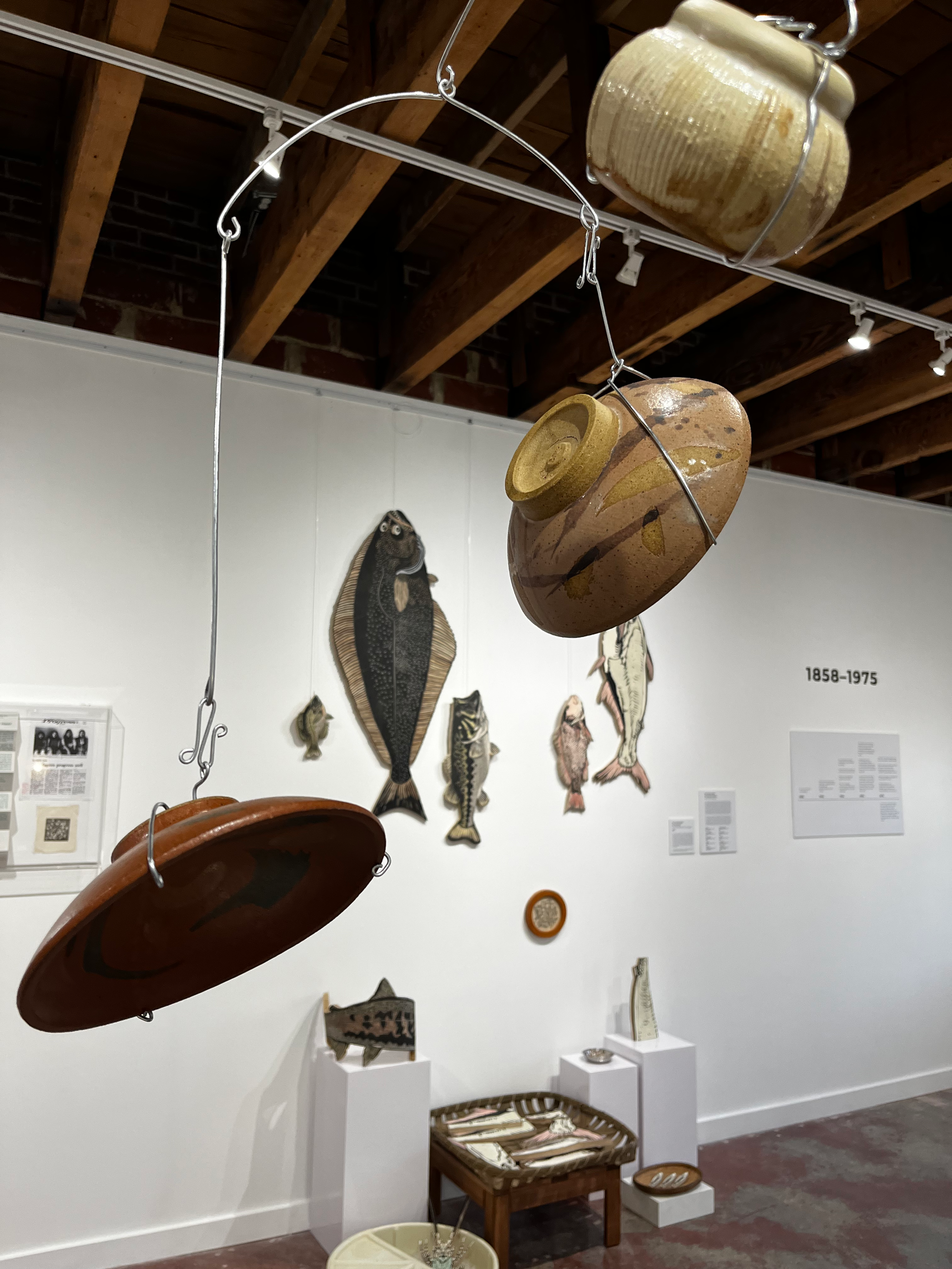 Lightness doesn’t mean a lack of weight, and a sense of distance doesn’t mean something’s actually far away. There’s space in here to feel these long, deep journeys. The personal histories on those three timeline panels hang from that line like Dao’s bowls hang from the ceiling—bowls among which I unexpectedly found myself, almost banging my head against them, as if they’d been caught in the act of falling around me, or were waiting for a familiar hand to reach up and take one down the way a grandma would in her well-loved kitchen. I put a hand up to shield the hanging installation from my movement and noticed, below my sight line, a broken plate painted with the words “No one thought to save us, too.”