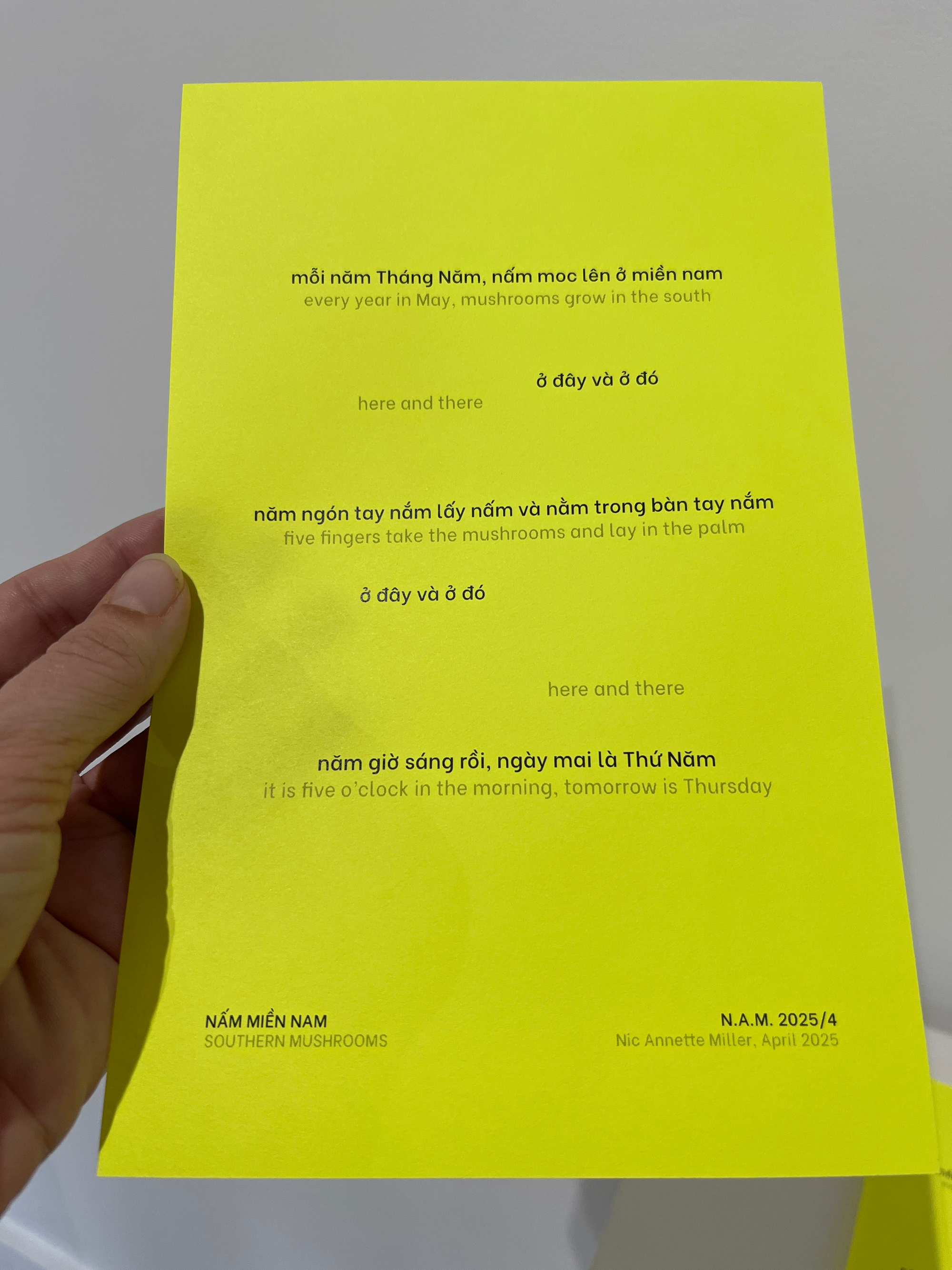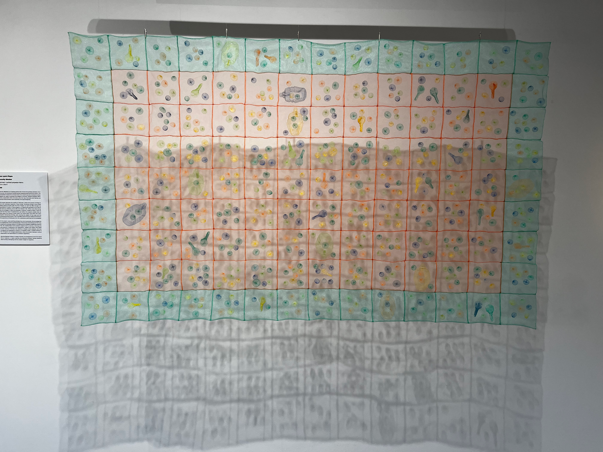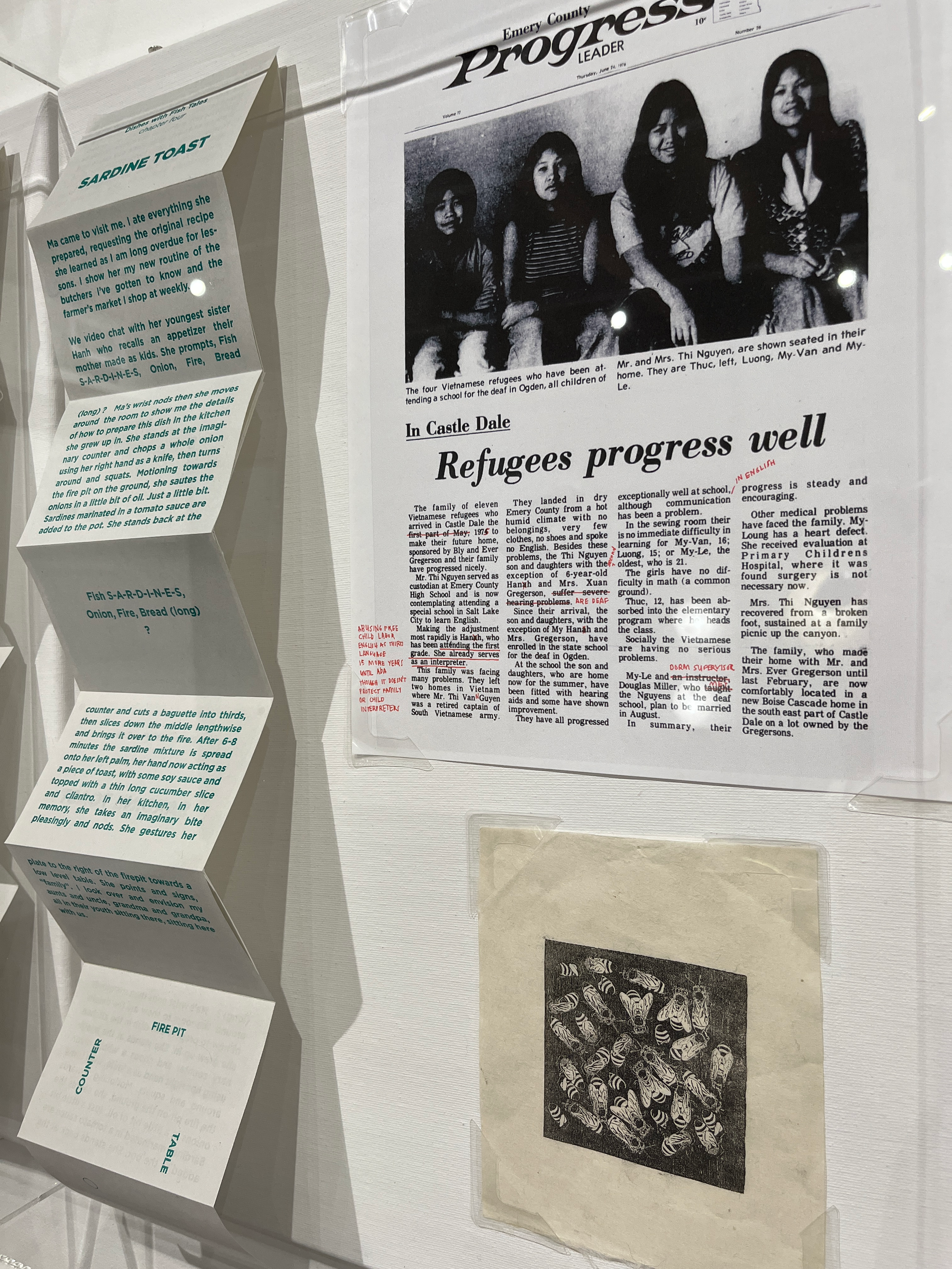 The lightness in the room feels like a whisper through time. Generational inheritances see-saw across the show and travel forward through conflict, migration, and love. Many of these pieces are neutral-toned, but there are notable exceptions, like the bold red pen Miller used to correct a 1975 newspaper report, or the baby’s-room hues of Phạm’s haunting “Security Blanket,” the grid-like shadow behind which shows up as strongly as the quilted form itself. Miller’s poem about mushrooms (printed on fluorescent yellow paper), her ASL poem “The Land” (which runs on an old-school iPhone), and her video installation “Our Tones, Our Wrists, Our Home” (located somehow outside the timeline as it plays in a corner down a hallway, moving with its own pulse of communication) are likewise vivid in color, the latter topped with a migratory ascent of orange and black butterflies.