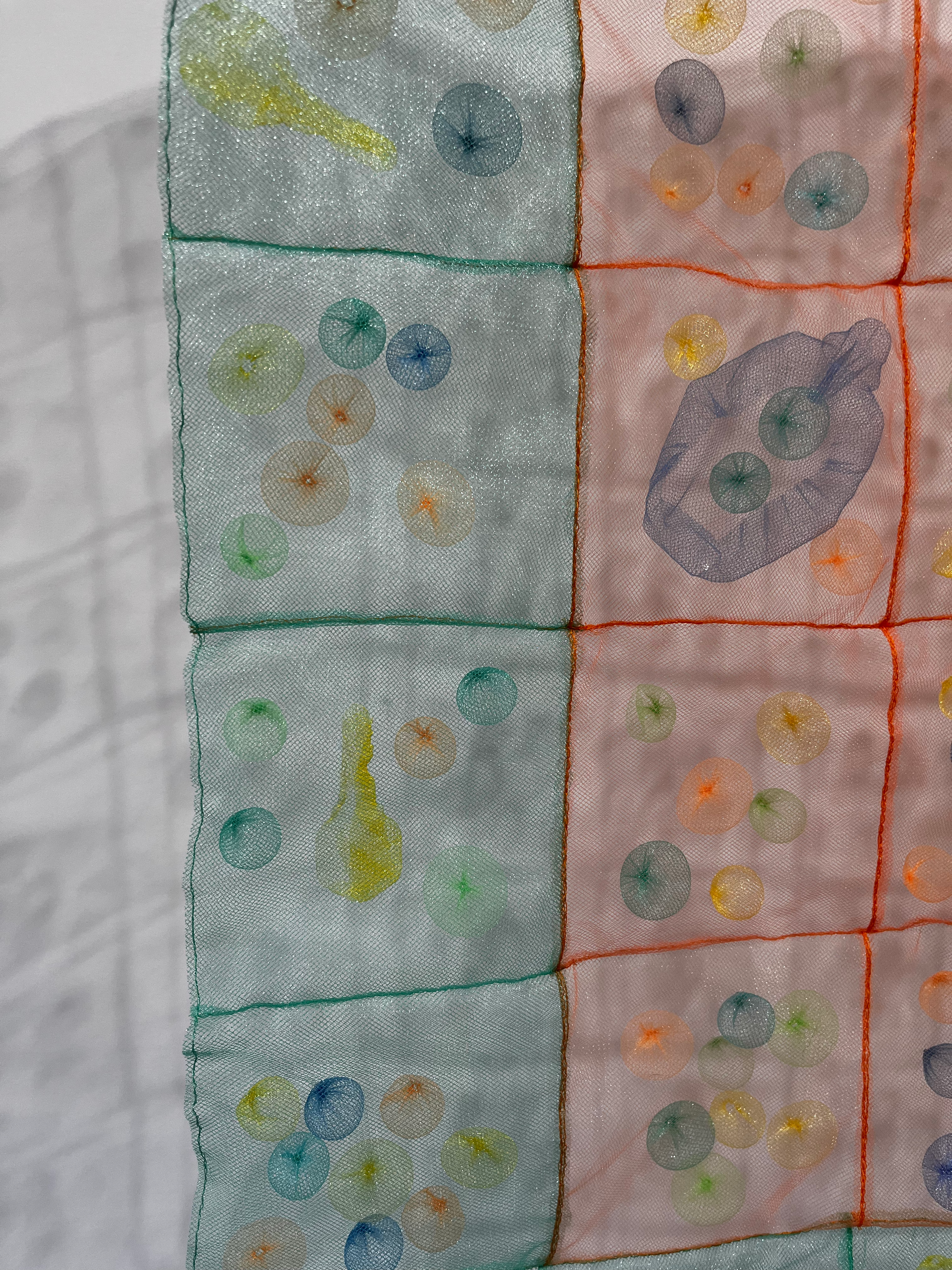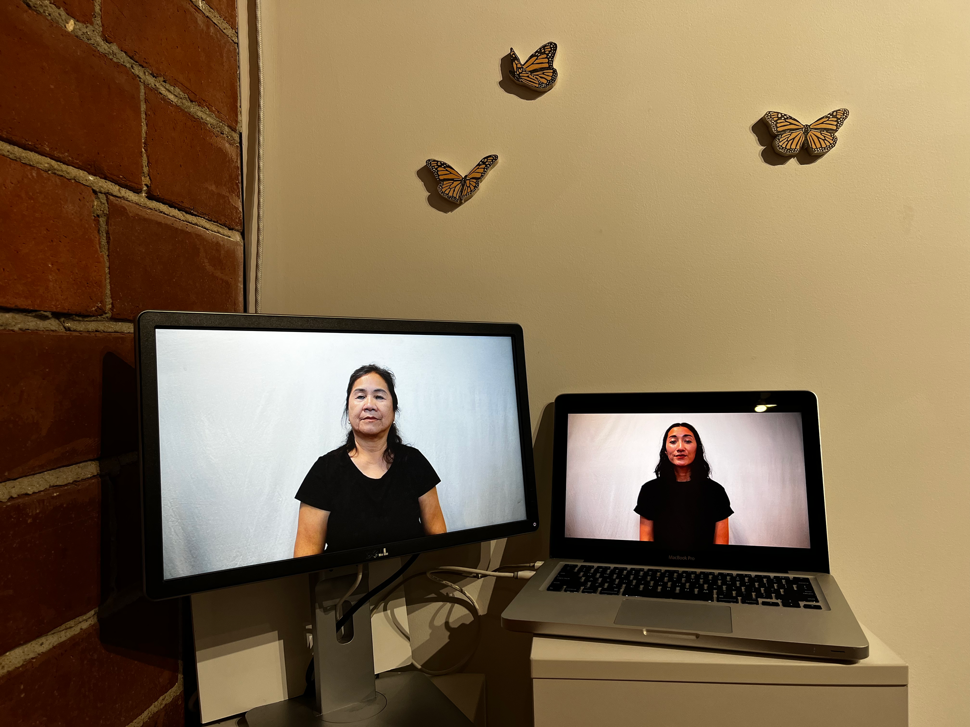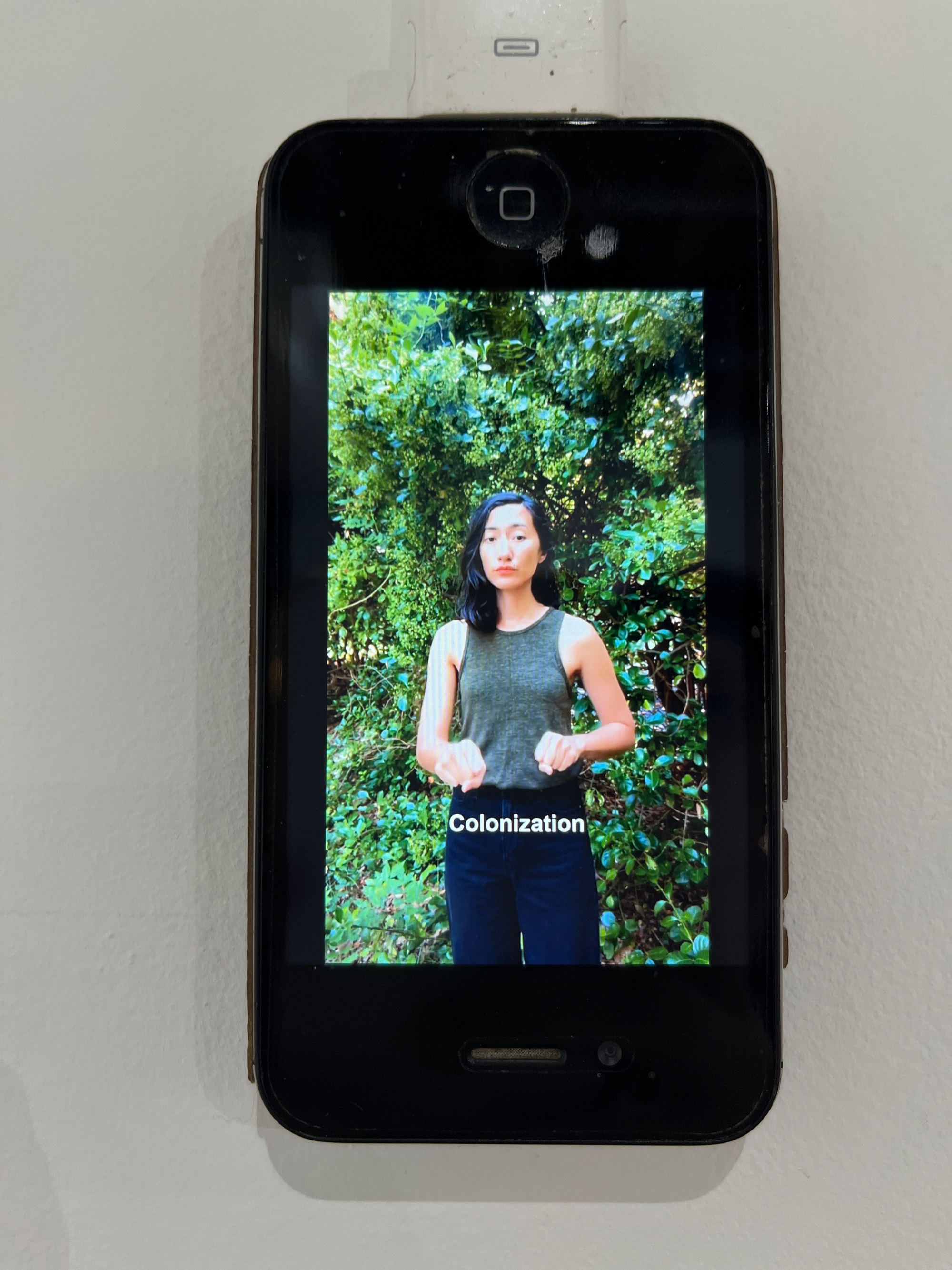 The lightness in the room feels like a whisper through time. Generational inheritances see-saw across the show and travel forward through conflict, migration, and love. Many of these pieces are neutral-toned, but there are notable exceptions, like the bold red pen Miller used to correct a 1975 newspaper report, or the baby’s-room hues of Phạm’s haunting “Security Blanket,” the grid-like shadow behind which shows up as strongly as the quilted form itself. Miller’s poem about mushrooms (printed on fluorescent yellow paper), her ASL poem “The Land” (which runs on an old-school iPhone), and her video installation “Our Tones, Our Wrists, Our Home” (located somehow outside the timeline as it plays in a corner down a hallway, moving with its own pulse of communication) are likewise vivid in color, the latter topped with a migratory ascent of orange and black butterflies.