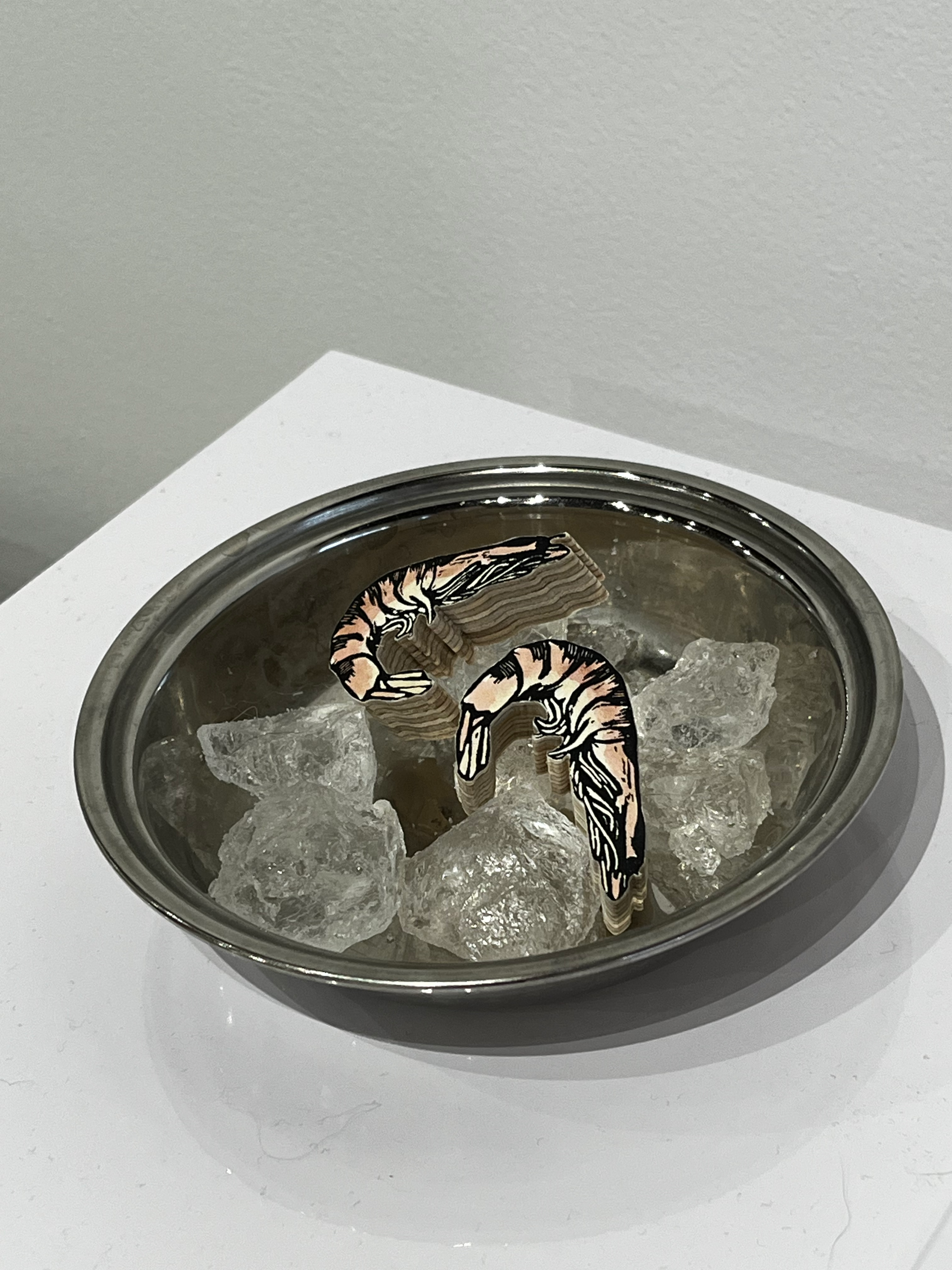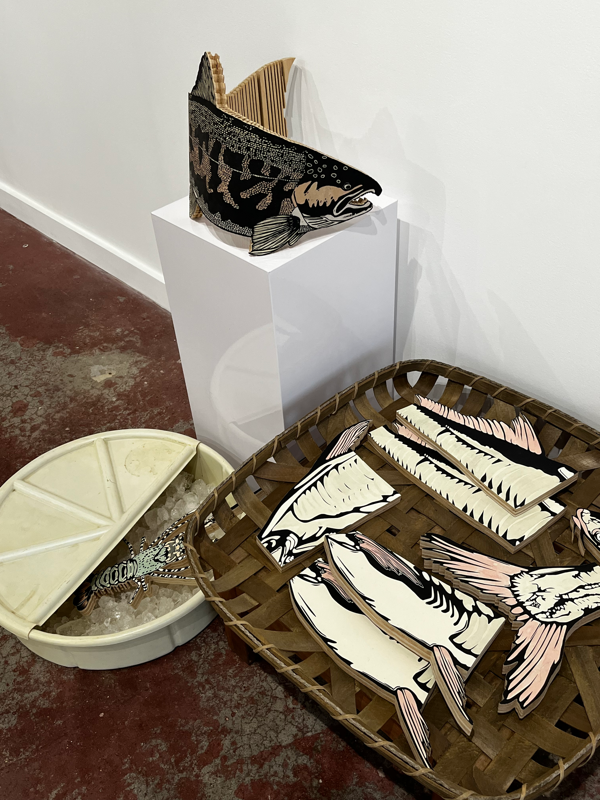 There’s humor here, too: several of the fish sculptures are literally displayed on ice. The promise of flavor in Miller’s work actually made me salivate. In addition to the names of all those fish, there are the titles of four potent little short stories: “Boiled Lobster,” “The Yellow Thing,” “Spring Roll Buffet,” “Sardine Toast.” Embedded in these tales are the awkward, generous, confusing human stories that link families through food, tracing belonging within the fractures of geography, language, and time.