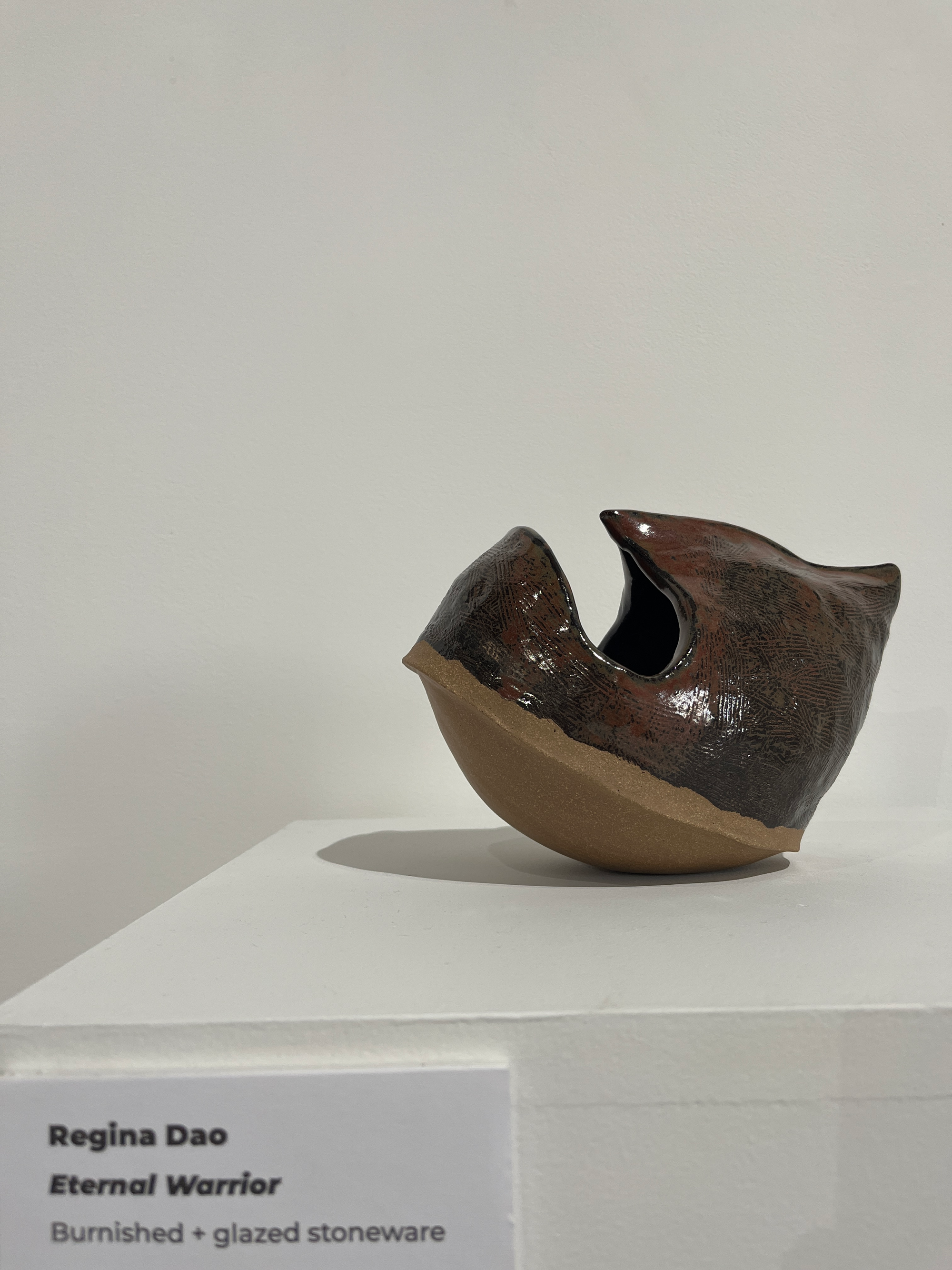 The detail in these works—the gritty glaze on those bowls, for instance, which feels like captured debris, or the globular geometric shapes of Phạm’s lantern quartet—creates an intimacy within all that space, inviting the senses to switch on. The density of memory, effort, and physical presence is here in full, as in the tilted, hollowed-out sweep of Dao’s “Eternal Warrior” and the vigorous, muscular striations of the sculptural woodcut and serigraph prints in Miller’s “She Takes She Shares,” part of her ongoing “fish market” series.