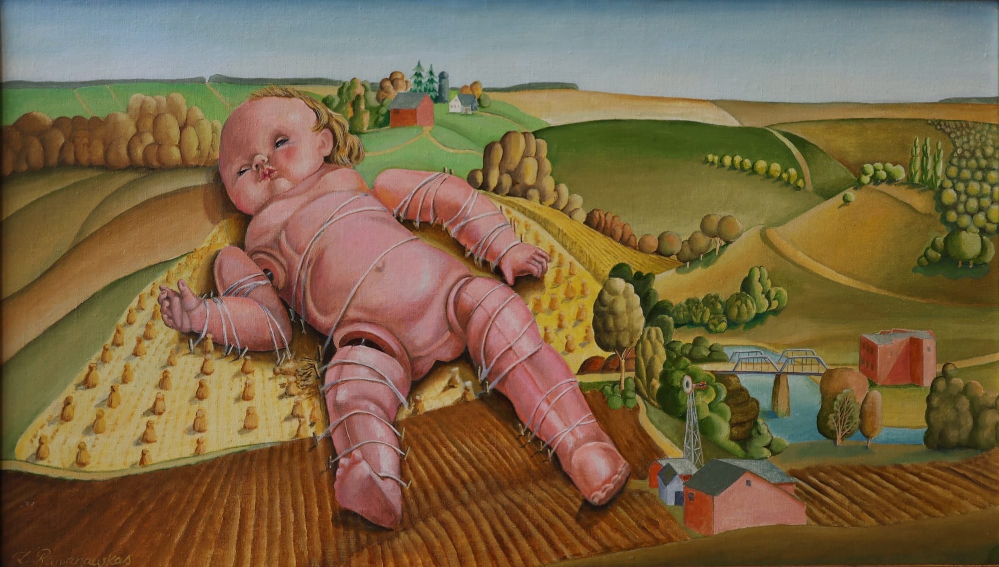 This spirited renewal, if the show is any indication, involves a fixation on dolls that Ramanauskas justifies through the sheer number of scenarios she dreams up for them. There are dolls piled against the wall in a way that is eerily reminiscent of firing squad victims. Another giant dolls is discovered lumbering around a construction site at night. Still another sits in front of a mirror, cradling a doll skull, as if in contemplation of its toy mortality. And then there is the doll tied Gulliver-style down to an otherwise bucolic landscape, the scale of the image so vast that the fleeing farmers might be invisible to the eye.