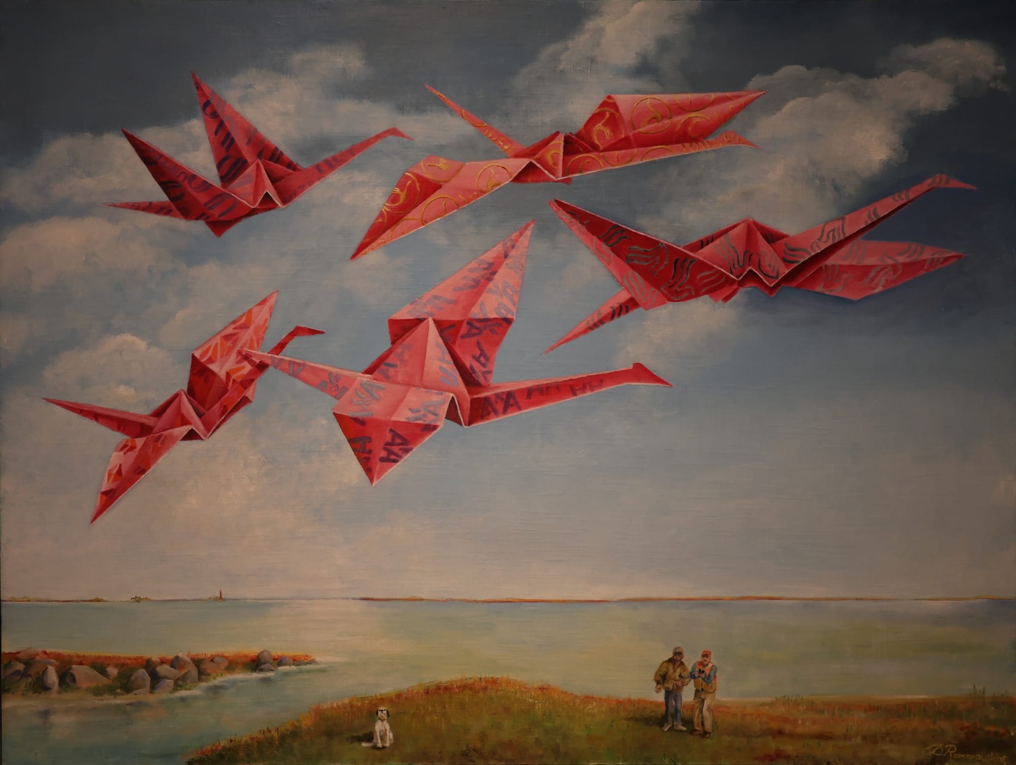 As one might expect from the above, Ramanauskas has many muses, whether it's a flock of origami cranes flying over a seascape, another paper crane in flames, falling through the sky, or an old man fighting a small dragon in his garden with gardening tools while younger people — presumably his family, there for a picnic perhaps — stand idly by and watch. In every case, the subjects are rendered in the same mostly realistic, matter of fact style, somewhere in the realm of portraiture or an accomplished children's book, and all to the effect of lodging many of the images in the memory, not soon to be forgotten.