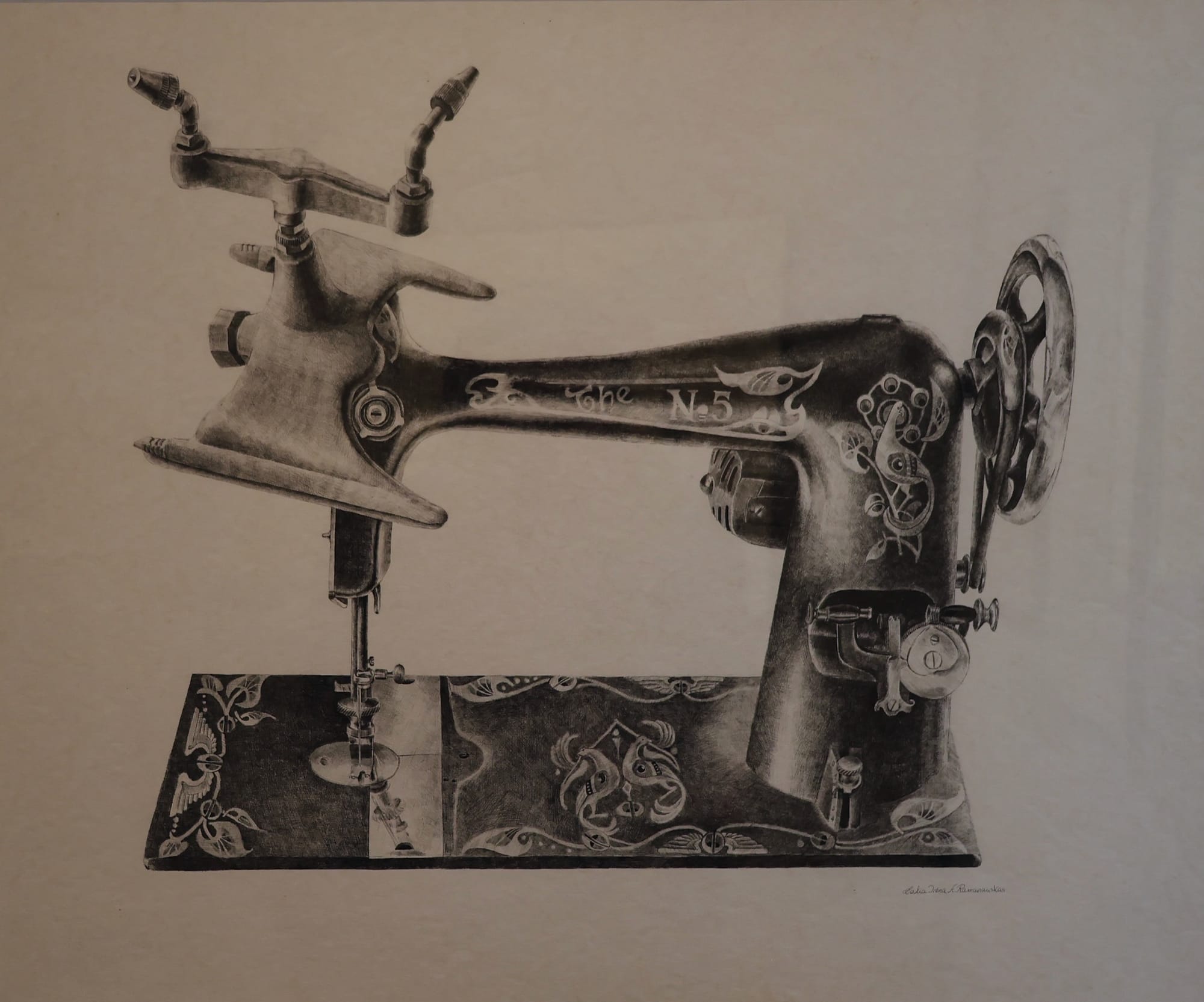 But in the end, the visuals that stuck with this viewer the most were those in which Ramanauskas took inanimate objects and made them resemble living creatures. Under her hand, a sewing machine is rendered bovine, and this one looks perhaps a little smarter than the average cow. It's inquisitive, curious. Somehow, as you look at it, you get the sense that it's returning your gaze. It's a good question which one of you figures out the other first.