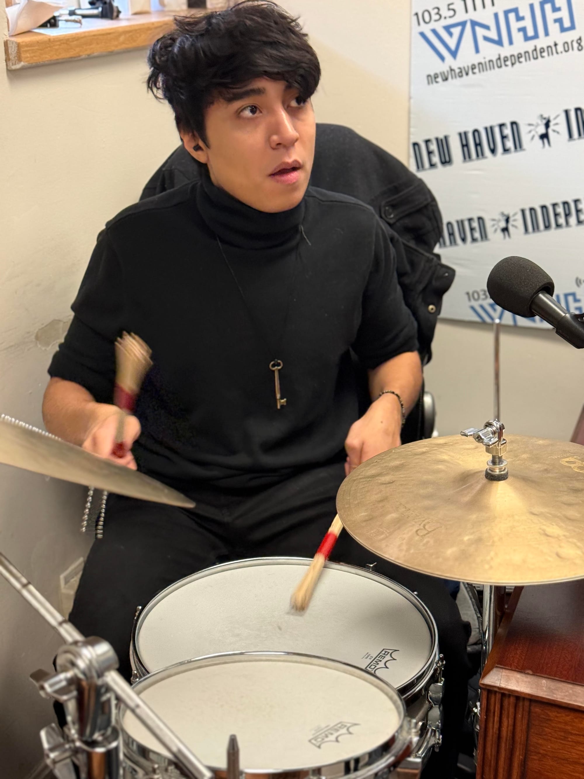 Corona-Galan played two of those improvisation-heavy instrumental originals with bandmates Brendan Castro (drums) and Matthew Munzner (bass) live on WNHHThursday after they managed to squeeze their instruments and amps into the tinest “tiny desk” space on the FM dial.