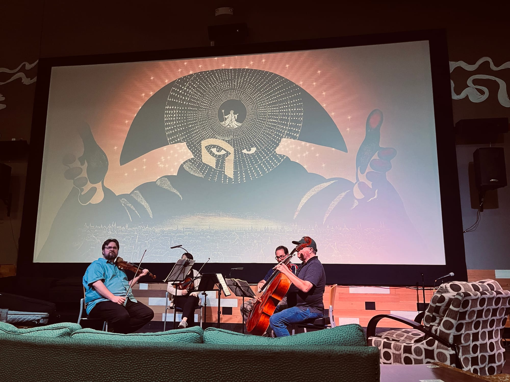 I wasn’t aware that the already long film was to be the 20 minute longer director’s cut until the introduction by one of The New Parkway’s employees. But, never having seen that version of a favorite movie I’ve watched many times, I was ready for the just over three-hour running time. And I was even more ready for the quartet, hoping they’d perform pieces by Salieri, played brilliantly in the film by F. Murray Abraham. The screening was the first of the “Music Legends Film/Concert Series” featuring the Berkelium String Quartet, a new chamber ensemble of Bay Area musicians founded in September 2024.