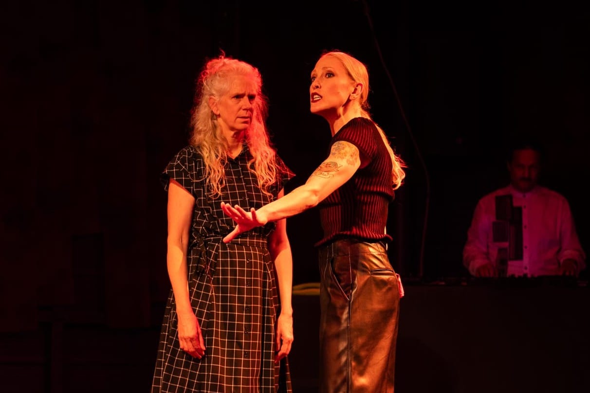 Inside the Kit Kat Club, the Weimar aesthetic has been shed in favor of an updated wardrobe heavy on Doc Martins and harlequin stripes, the band replaced by a DJ and guitarist Joshua Pollock (who doubles as Herr Schultz, the Jewish tenant of Fraulein Schneider, played by Beth Wilmurt, the two entangled in perhaps the most true and tragic part of the story, a senior love story as sweet as it is doomed). A sparse stage, made up of three tiers of painted black boxes, pushed the audience into crowded corners of the room. The wardrobe updates and the clever use of mirrors made it hard not to draw similarities between past and present.