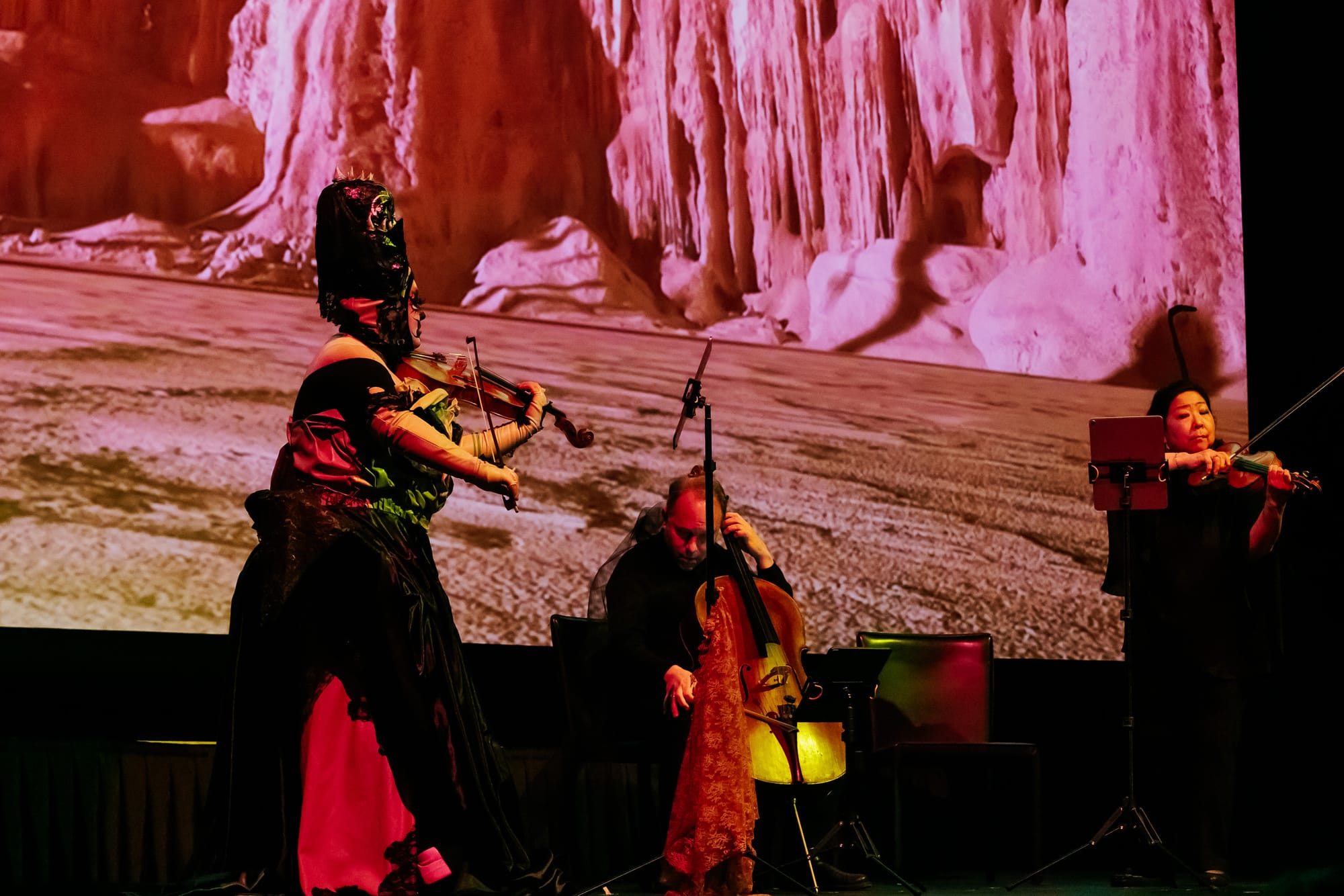 The show, broken into seven acts, took us from oceans to deserts to high mountain tops, and then to a glittering red moon. Obsurd was resplendent in a variety of handmade costumes—sheathed in blue to match the waters, morphing into a high fashion fungus—their looks subtly, and sometimes violently, escalated as the night wore on. Surreal haunting music paired with the sound of heavy breathing put the audience in fight or flight mode, and then, at the height of the unease, playful bits grounded us again. Though a strange spectacle, the journey was emotionally relatable. Most powerful was the last “Day” in which Obsurd’s parents Christopher Contanza (cello) and Debra Fong (violin) joined them on the stage trailing long black veils to play together as a family.