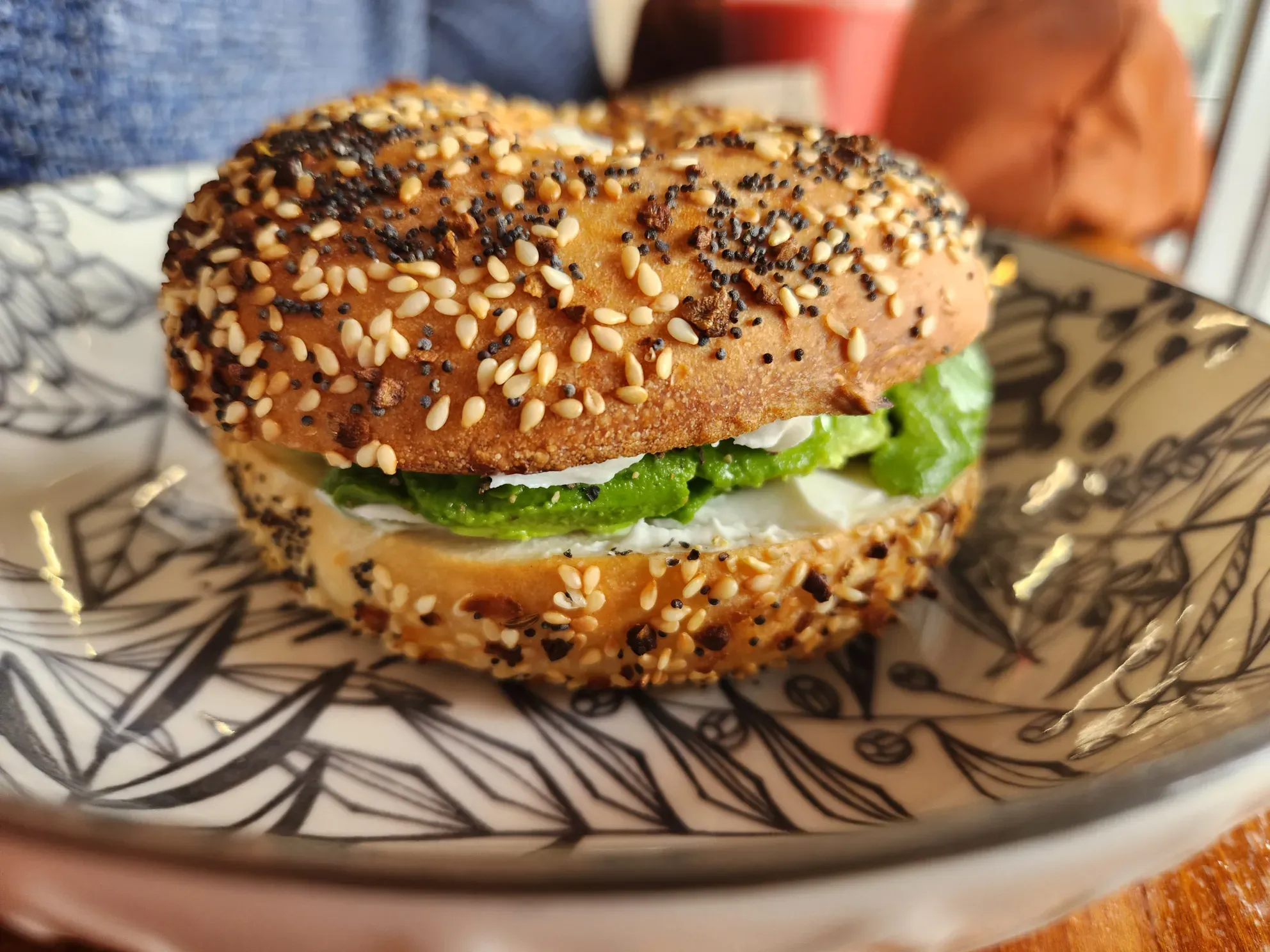 Soon our food was up too, with equally reasonably priced “deluxe” avocado toast, and everything bagel with vegan cream cheese and more avocado, and a Greek salad. Though their pastries are from Starter Bakery, which makes excellent baked goods, the bagel was … not worth many words. Suffice to say its texture and flavor left much to be desired, as did the unseasoned fruit and tofu cream that managed to give big unbaked Pillsbury crescent roll vibes, in both scent and taste, and that the sum of these perhaps perfectly good parts was less than stellar.