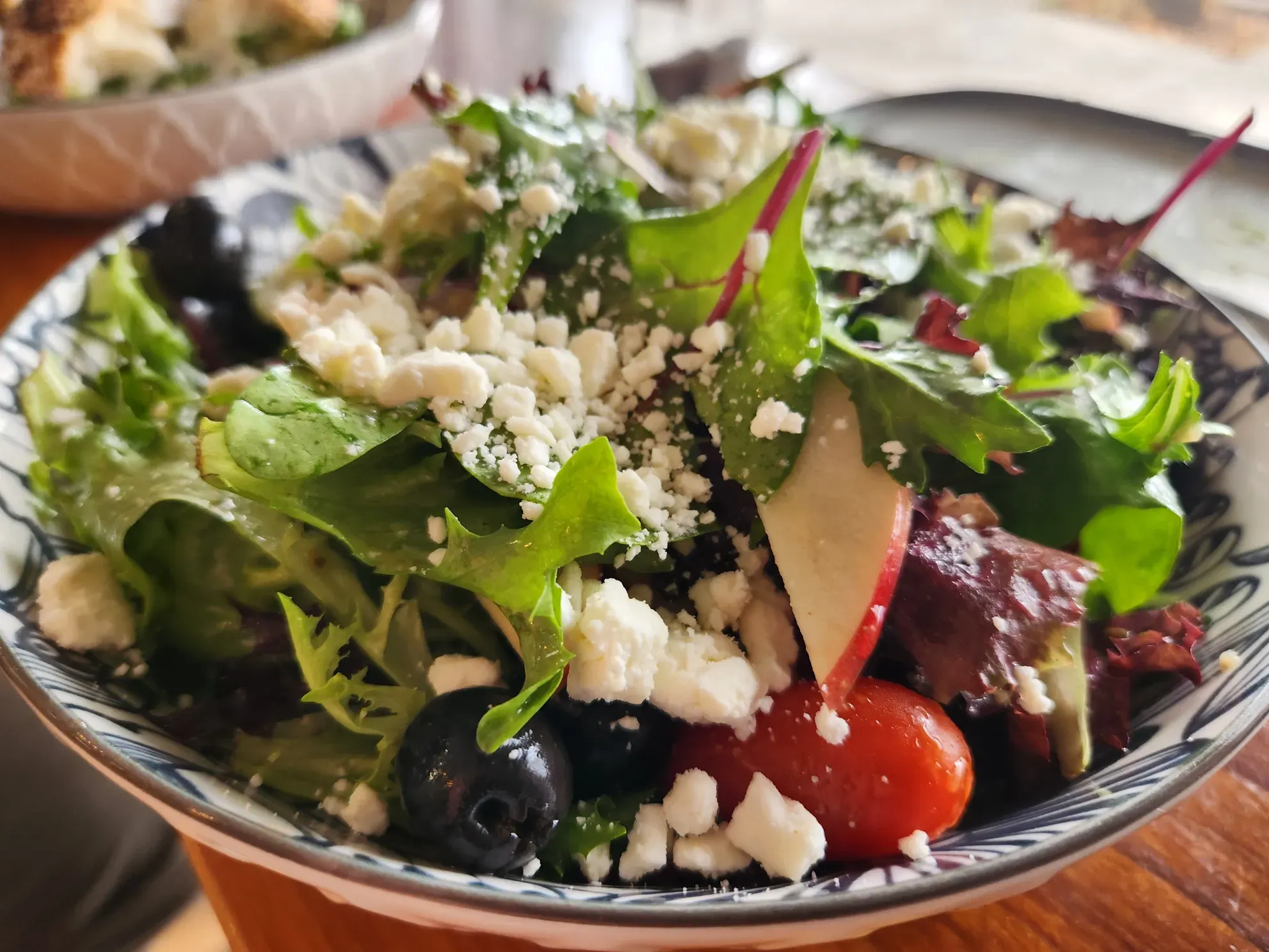 The toast and salad, however, were lovely, if unconventional. The mixed greens were fresh, the cheese soft and bringing exactly the right level of salt and umami, and the vinaigrette tangy and delicious. Thinly sliced apples were a surprise but nice left turn, making for crunchy balanced bites with the red onion, grape tomatoes, and cucumber. No bell peppers or dried cranberries were in sight, nor were they missed, and the black olives, whole and from a can, were a miss but did not taint any of the other ingredients — I simply suggest saving them for the pizzas.