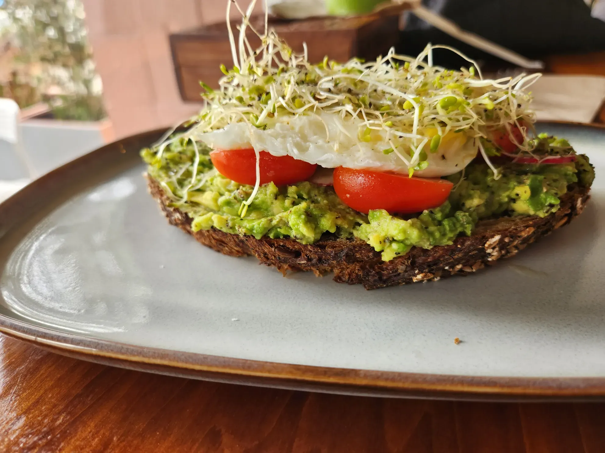 The soft, thick slice of oat-and-groat flecked toast was topped with a generous hand of fresh, lemony avocado mash, sliced radishes, halved grape tomatoes, a fried egg, and nice portion of small sprouts. I prefer a softer, creamy yolk, oozy even, but as I did not specify said preference, this harder finish was fine. The peppery radishes and sprouts were excellent additions, and everyone’s favorite fruit (avocado) maintained center stage in the melange, providing plenty of creamy mouthfeel. Few condiments were available and I would have loved a bit more of a kick, but found this a satisfying slice and excellent, slightly heartier companion to the salad.