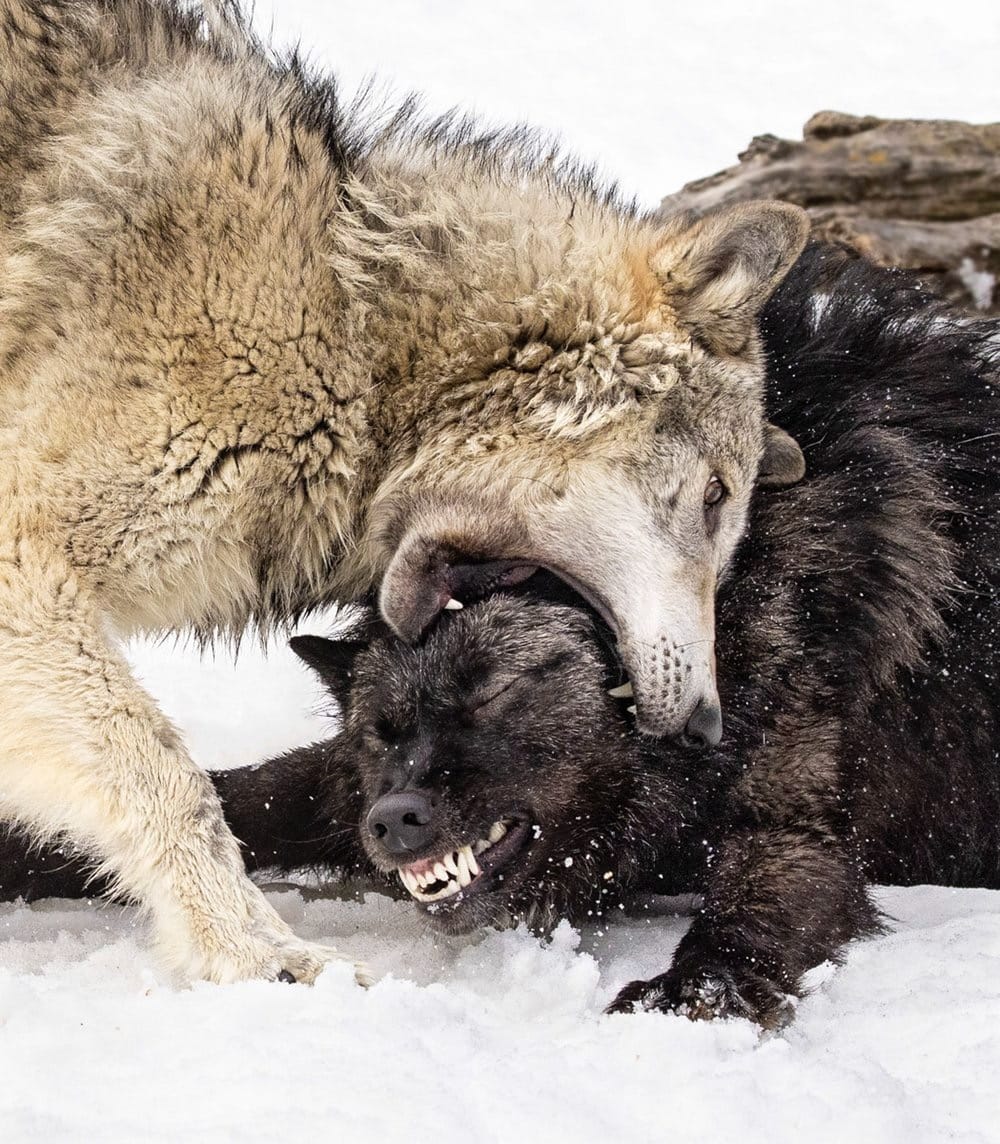 John Templeton’s Two Tundra Wolves also draws the viewer into a powerful confrontation. The wolves are locked in a struggle for dominance, their teeth bared in a primal display of strength. The contrast between the wolves' light and dark fur calls to mind the anthropomorphic tension between opposing forces, the sides of light and dark forever called on to fight and conquer persisting now more than ever.