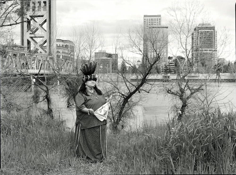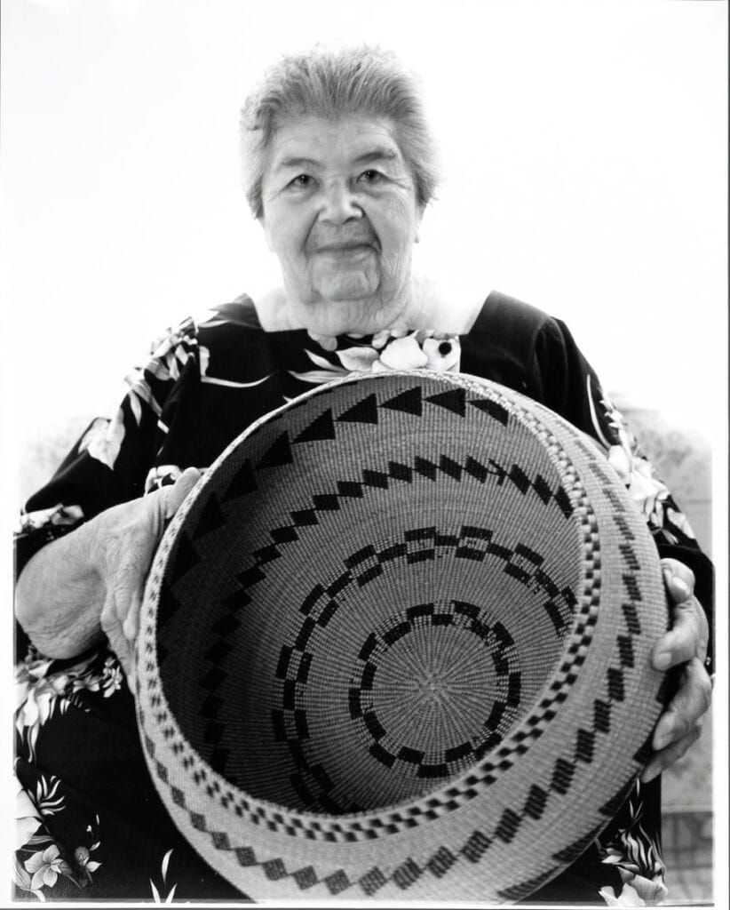 One of the most striking aspects of Aguilar’s work is the sense of pride that radiates from his subjects. In his portrait Elsie Allen (Pomo), an older woman holds a handwoven basket. Her gaze is direct, her smile shy but sure, her face etched by the passage of time. Surrounded by white light, the history embedded in her expression and her craft speaks volumes about resilience.