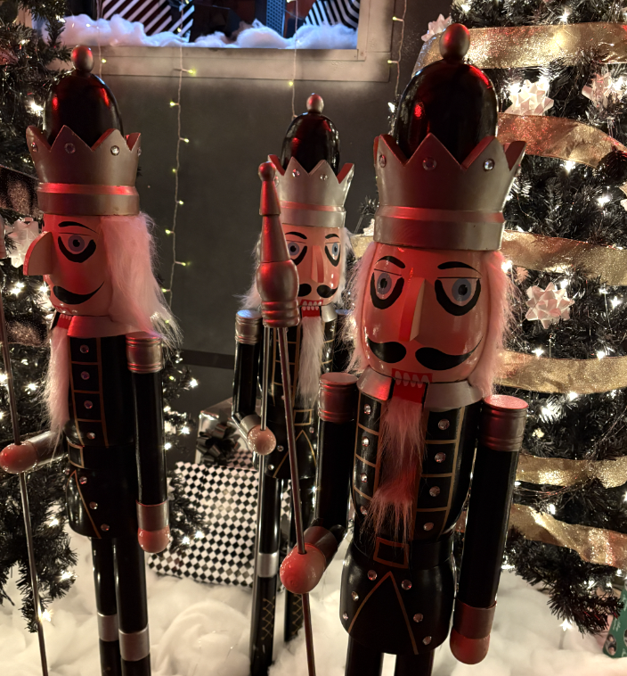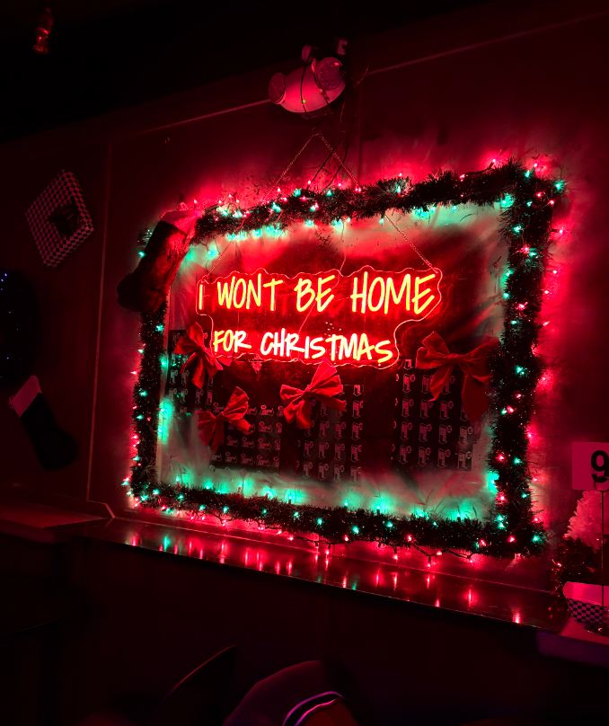 But Emo Christmas matched my energy. The space had low lighting and was illuminated by twinkle lights on dark colored Christmas trees and neon signage with sayings like, “I Won’t Be Home for Christmas” a la blink-182 and “Taking Back Christmas,” a play on the band Taking Back Sunday. Stockings were hung by the bar with care, with names like Hayley W. and Pete W. on them. My personal favorite decorations were Santa Claus with an emo bang swoop and nutcrackers wearing black eyeliner. Each piece of decor made for the perfect backdrop for a photo with your friends.