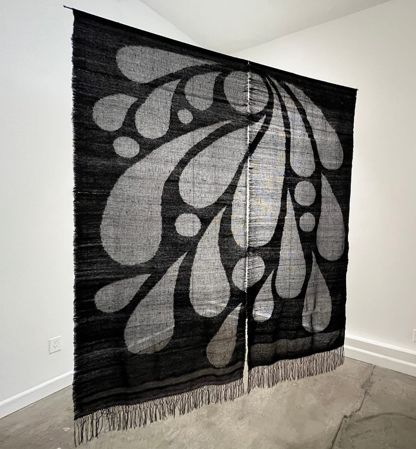 In the gallery’s other half were seven silk pieces by Christine Meuris, and the loom she uses to meticulously weave those works (Meuris will be demonstrating her weaving technique on select dates at the gallery through the show’s run). They’re exquisitely crafted, each with a paisley design in varying patterns, semi-transparent. The weavings are delicate, elegant and fragile looking. My favorite was “Deluge,” a 76” x 60” work hung from the ceiling, the paisleys resembling stylized water drops (pictured at top). It’s in two pieces, but they’re in tandem, creating a unified whole. The craftsmanship is exactingly fine and I spent a good deal of time examining it. All of the seven pieces are splendidly airy, each unique but all in harmony with one another.