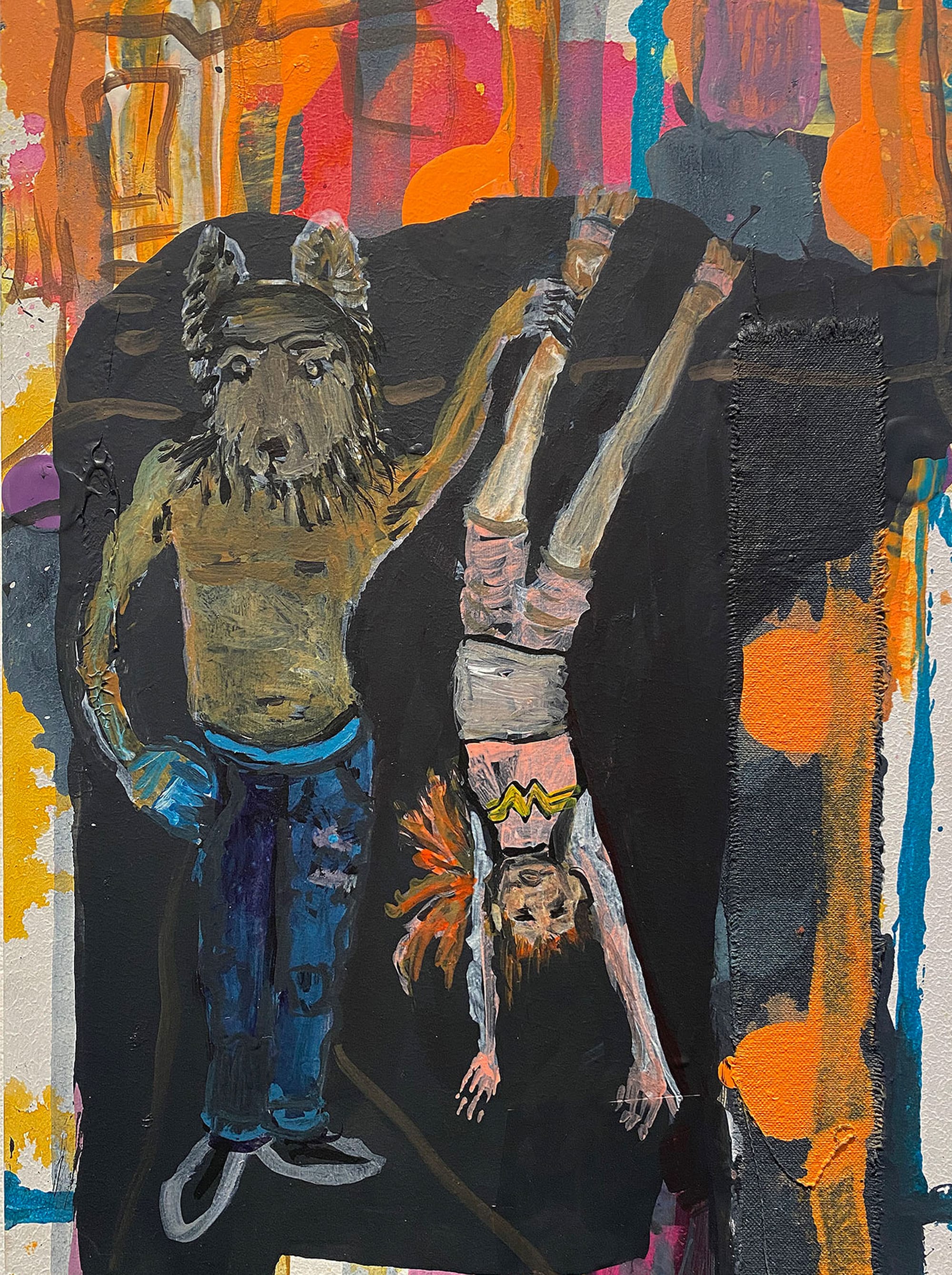 I was immediately drawn to a work entitled “This Ain’t No Twilight” which depicts a werewolf in jeans with a casual hand on his hip. He holds a young girl by the ankle, a shocked expression on her face, dangling from the lycanthrope’s hand. The figures are set against an abstracted background of vibrant colors: orange, purple, pink, and red; and oddly placed window shapes. I appreciated its aura, simultaneously humorous and menacing.