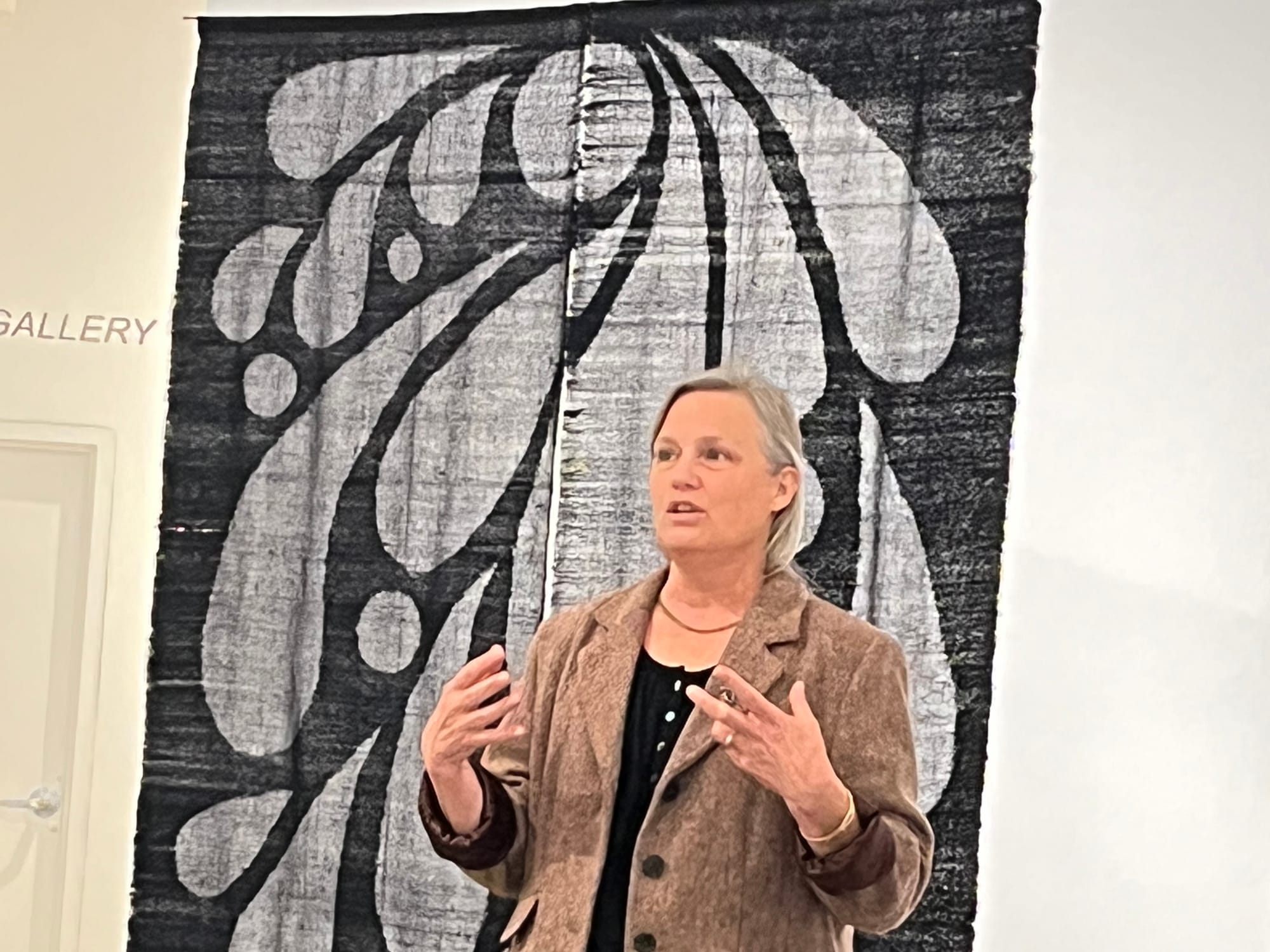 "Deluge" by Christine Meuris, 2025 (L), and the artist speaking (R).