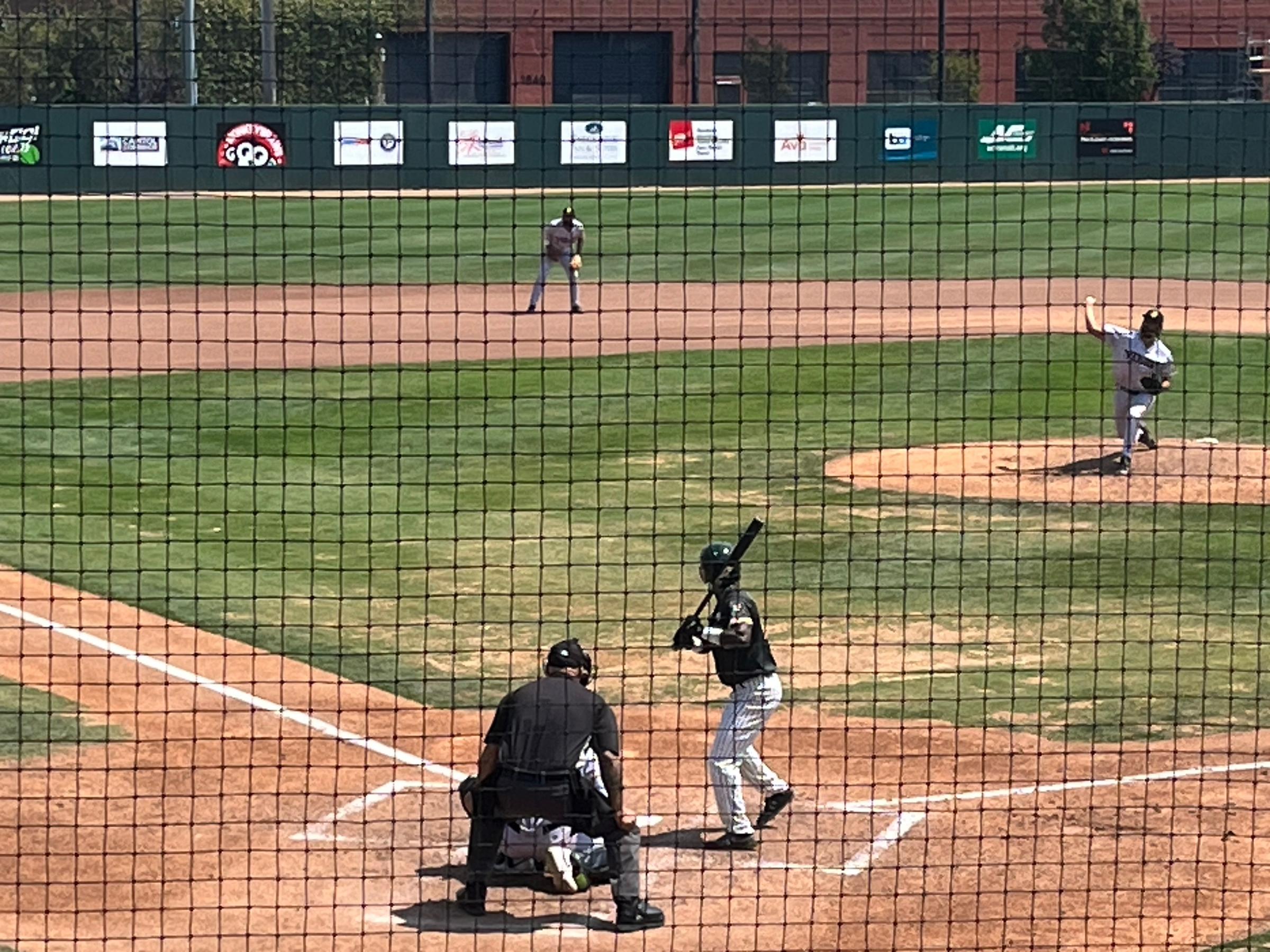 With the Wheelers leading 9 – 2 in the top of the ninth, Ballers Pitcher John Pyle tossed a clean three-up, three-down inning. Dondrei Hubbard came to the plate in the bottom of this final inning to hit a double, delivering once again and keeping hope alive. Then there was a long fly to left field for the second out. Shortstop Josh Leslie hit a grounder to reach first on an error by Wheelers Shortstop Braylin Marine, bringing home Ballers pinch-hitter Nick Adgar for an unearned run. Catcher Tyler Lozano then hit a squibber to the same spot. Ballers on the corners! But that was it. A fast grounder down the first base line had Wheelers First Baseman Braedon Blackford dive dramatically for the wayward ball to tag first base for the final out. Game over: 9 – 3 Wheelers. Congrats, Yolo. Nice win.
