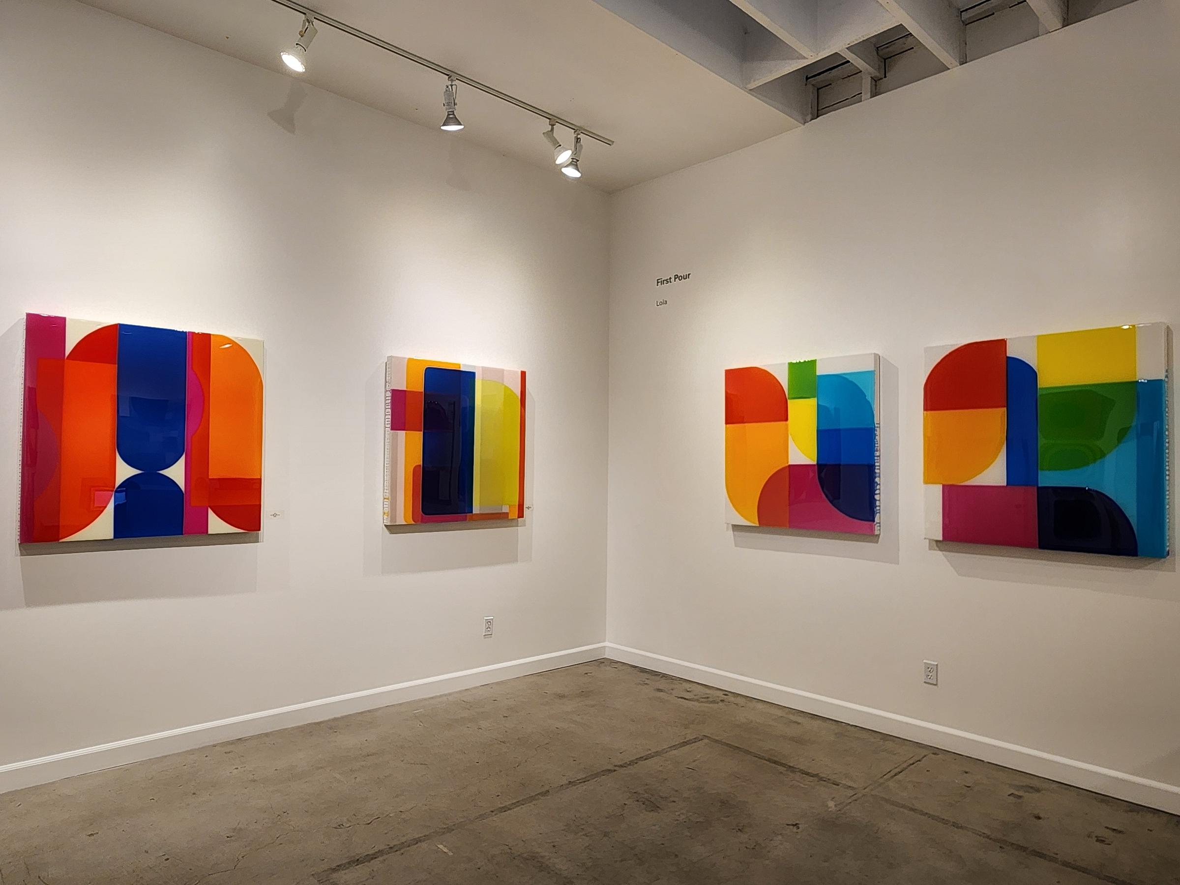 Lola built “First Pour” improvisationally. As the artist states online, “in the beginning I stand before a white panel, considering my first pour. This path leads to a constant discovery, a new evolution. Sometimes the layering is a spontaneous exercise while other times it is an experiment in composition. It is an intuitive process. The evidence is in the colors.”