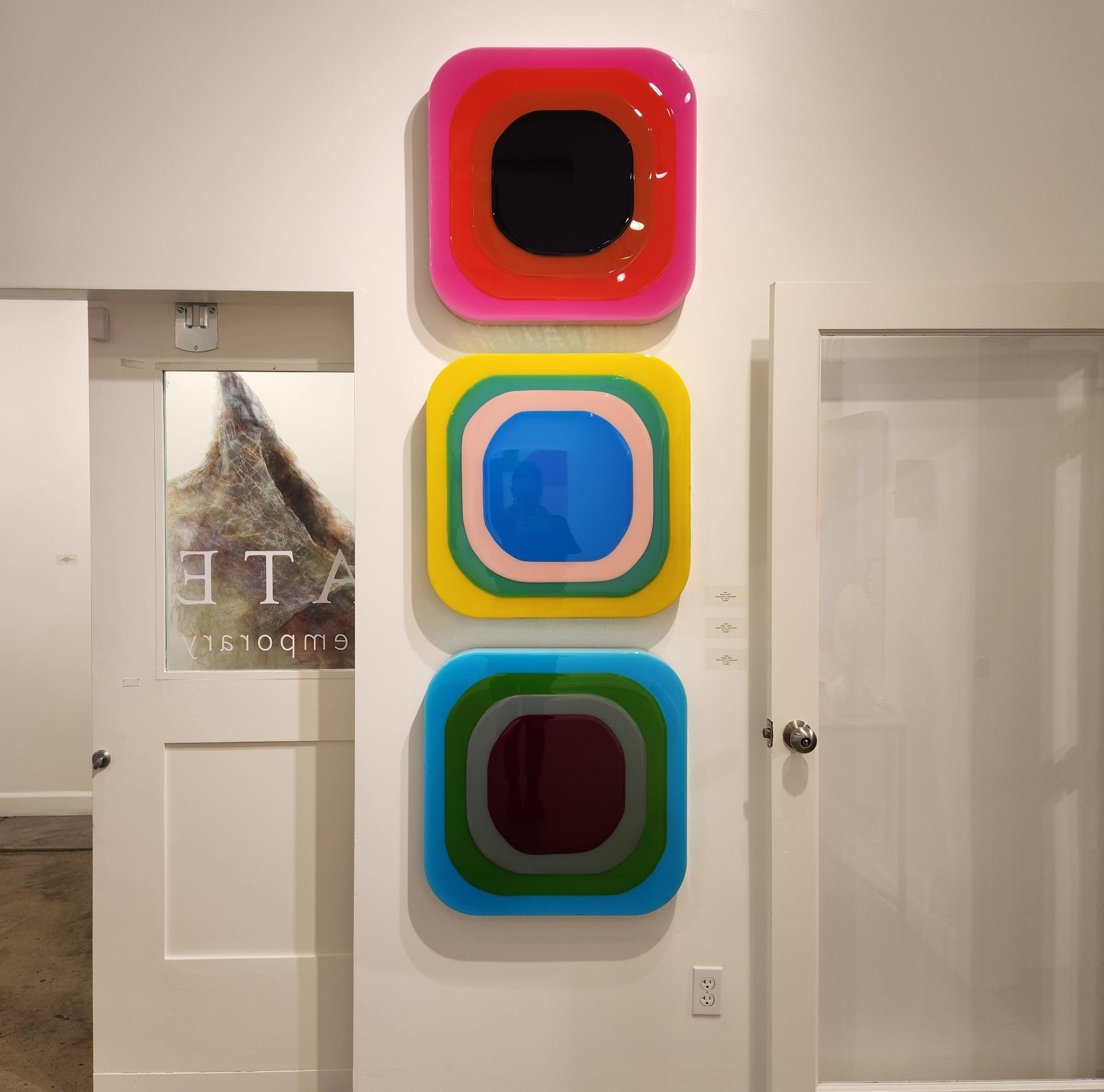 Eye-popping colors of tinted, layered resins in organic shapes ooze an unreal light. Some soothe, watery; others evoke an Instagram logo enlarged, tripled, glowing without internal illumination.