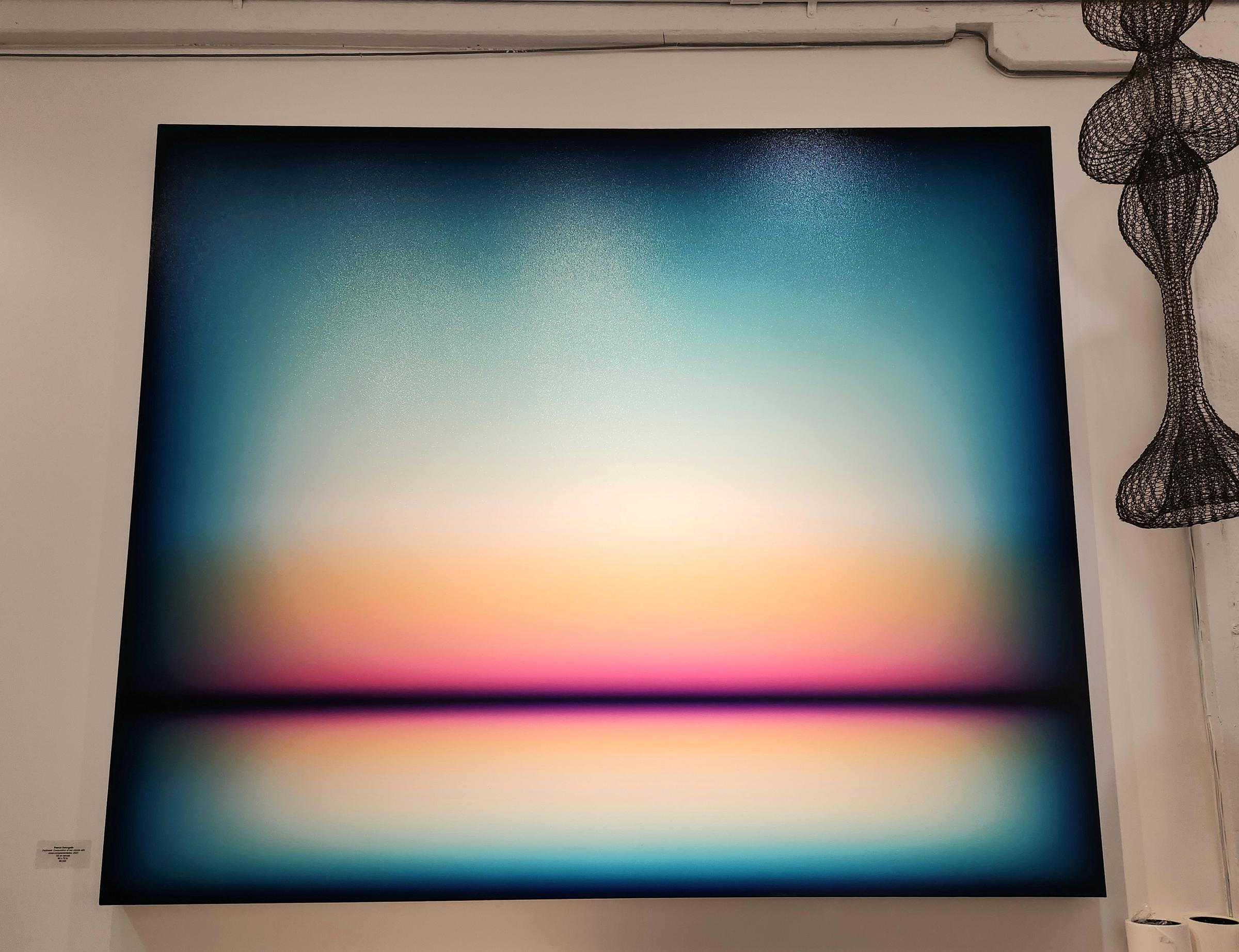 The largest and dreamiest piece to pull attention amidst that cacophony of artistic voices was Patrick DeAngelis’ Daybreak: Composition of two chords with cross-complementaries, a moody, emotive mammoth of oil on canvas at 60x70 inches. The surface is glossy with the texture of thick rolled paint, tacky and tactile, but also so smooth and cool looking it cried out to be touched (I of course did not). The deep deep blue blacks at the edges and center burst of sunrise and are both perfectly blended. The hues, so easy to veer pastel, cliche, drab, or garish and unnatural, straddle the line of the real and too-real, the imperfection of reality captured perfectly in an imperfect media.