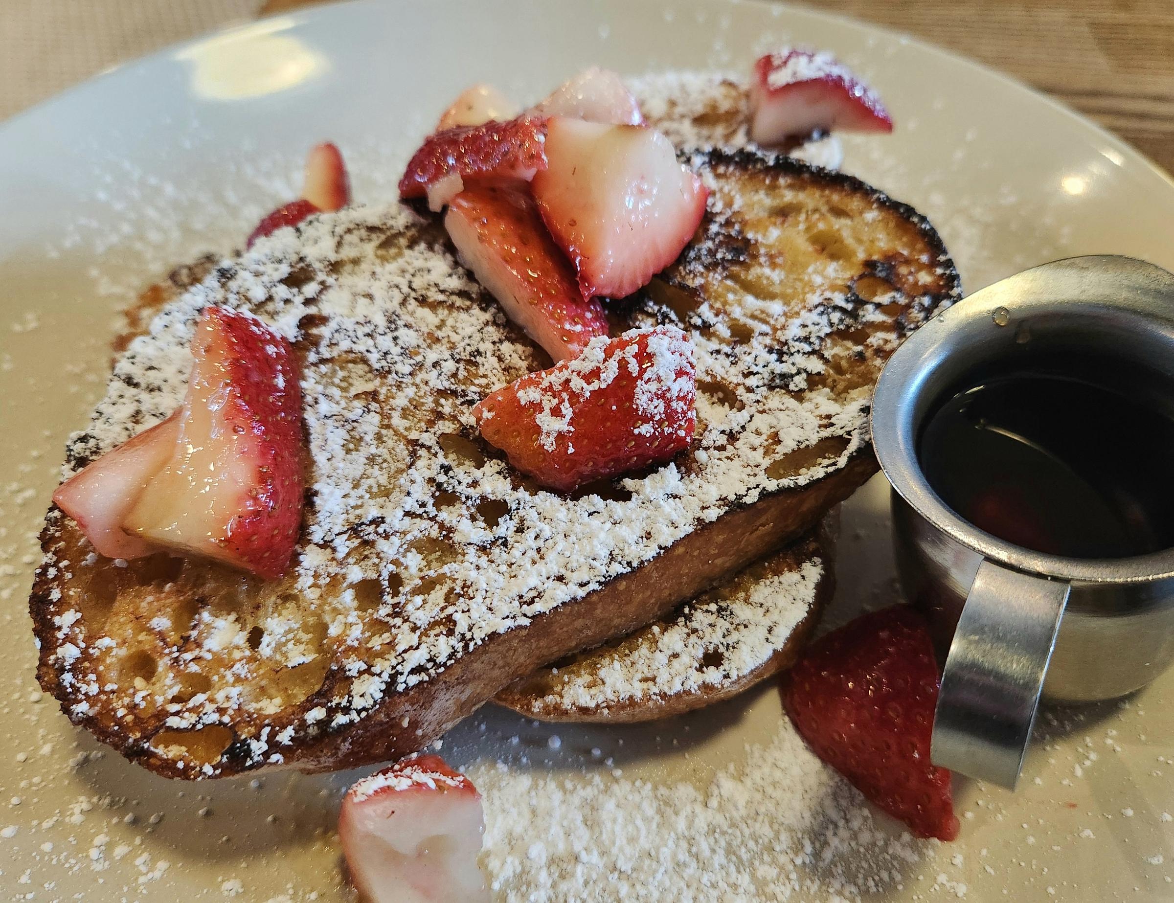 The French toast was fabulous (though also not that hot), with a real chew left to the bread despite its soaked treatment. A little tang from the sourdough, slices thin enough to knife through easily but thick enough to sink your teeth into. Barely sweet, a touch eggy, perfectly carmelized golden exterior. Warmed maple syrup and sliced strawberries rounded out each bite with juiciness and freshness.