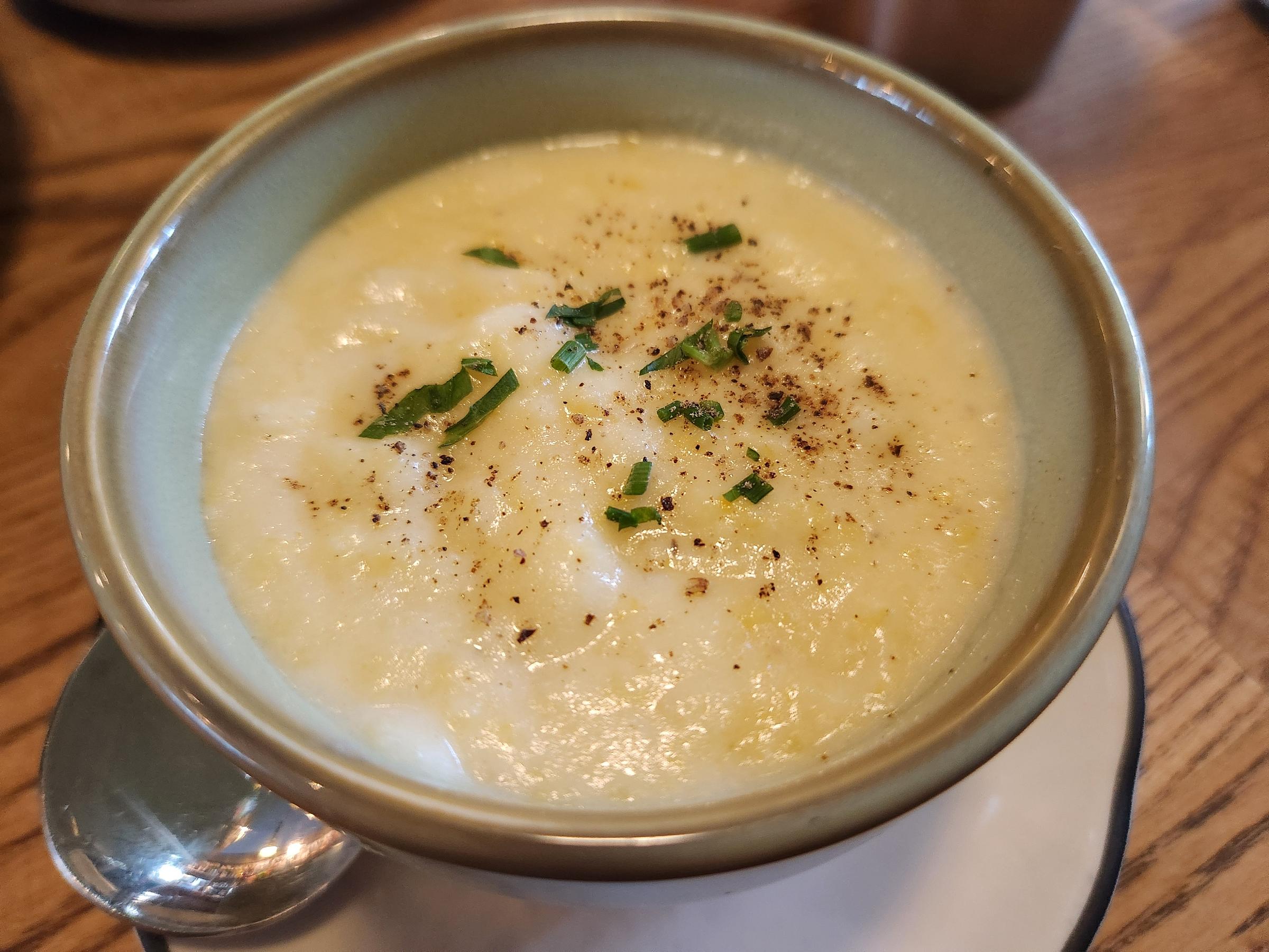 Hot and smooth, the polenta (pictured above) was finely milled with a handful of larger grains to temper the mush. A heavy hand of goat cheddar cheese made it creamy as all get out but did not leave a film or bring any glop to the porridge, just oomph. With a dash of pepper and chives on top, it was a real mug of comfort.