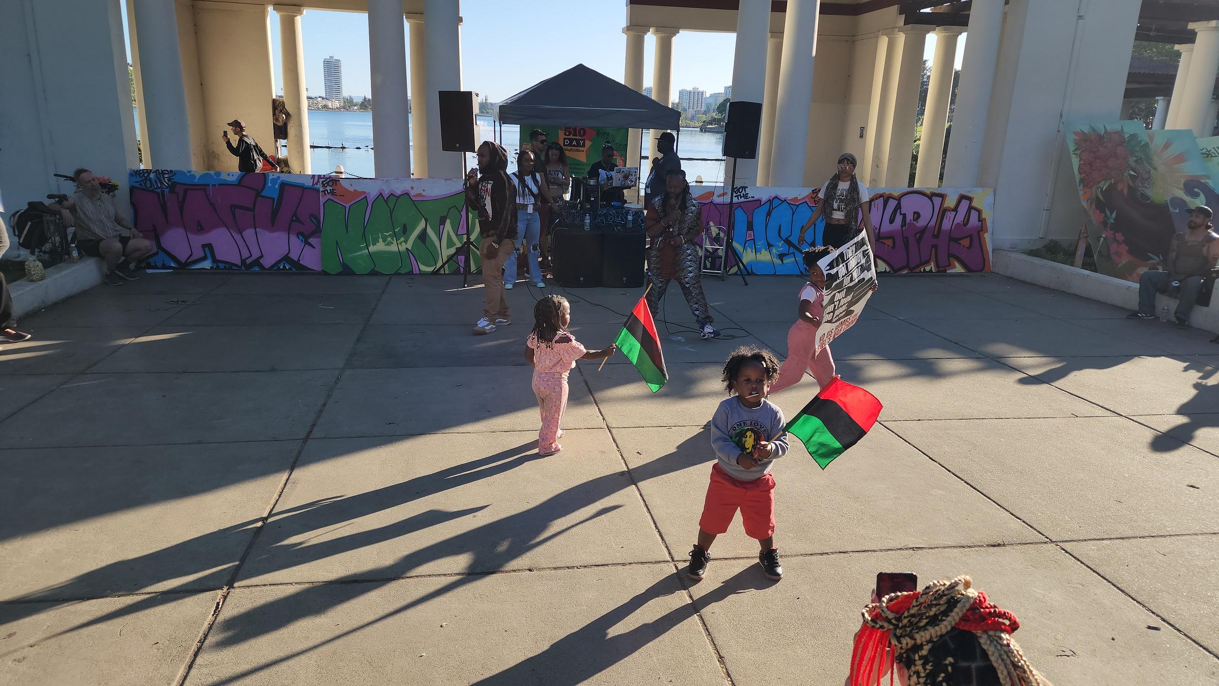 Music filled the air and vendors lined Grand Avenue from Euclid to Embarcadero, selling food and clothes. Booths sharing information about services for youth, families, and elders were sprinkled between the vendor booths, and local performers read poetry, rapped, and danced on two stages. The Black Market Stage was posted along Grand Avenue, and the We Still Here stage was at the Pergola.