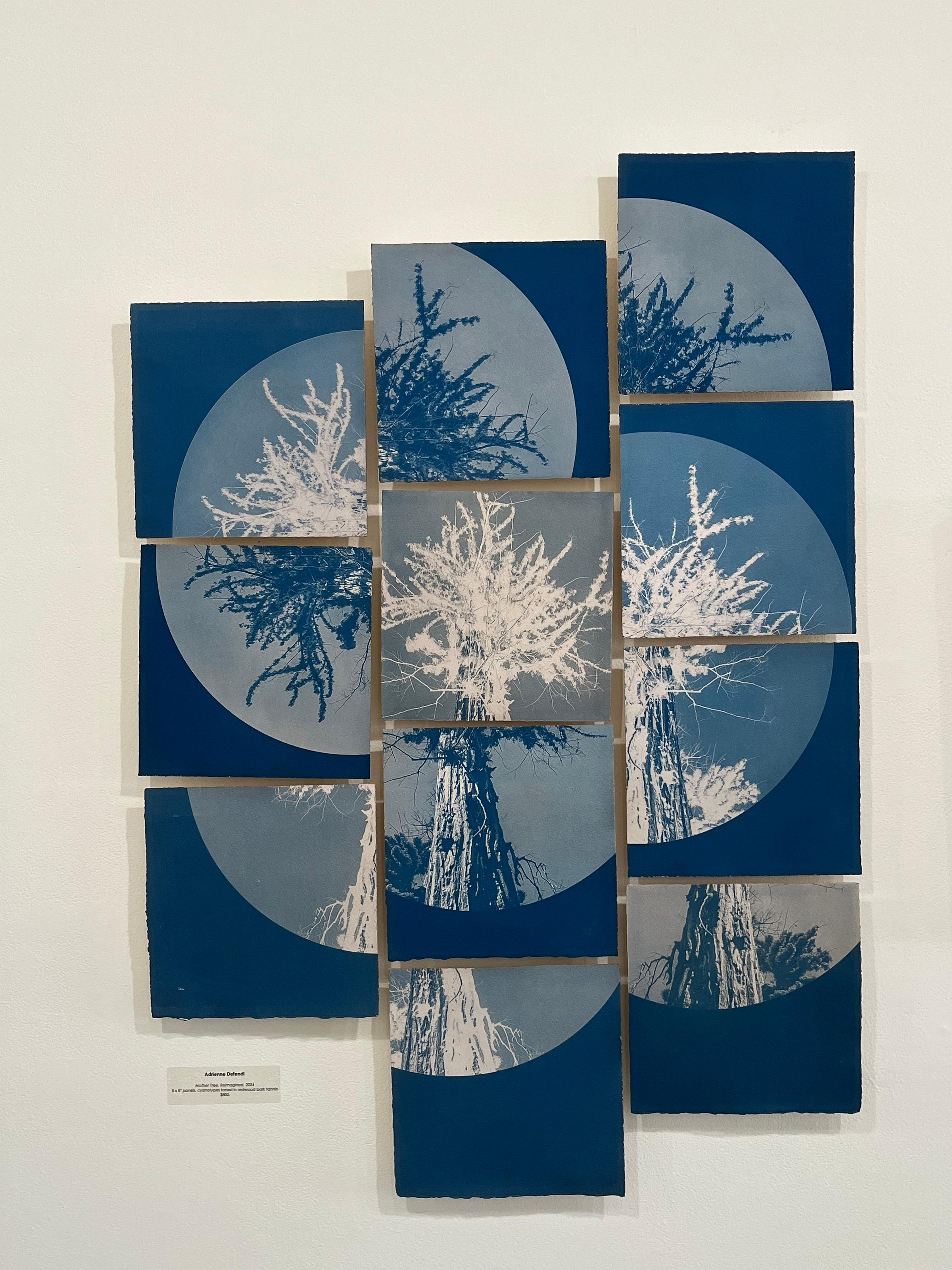 Tranquil too was Adrienne Defendi’s “Mother Tree, Reimagined” which is a multi-panel piece made of cyanotypes toned in redwood bark. This was another piece that I dismissed at first but returned to during my wander of the gallery. Its three-tone geometric composition is far more complex and thoughtful than I’d perceived at first glance.