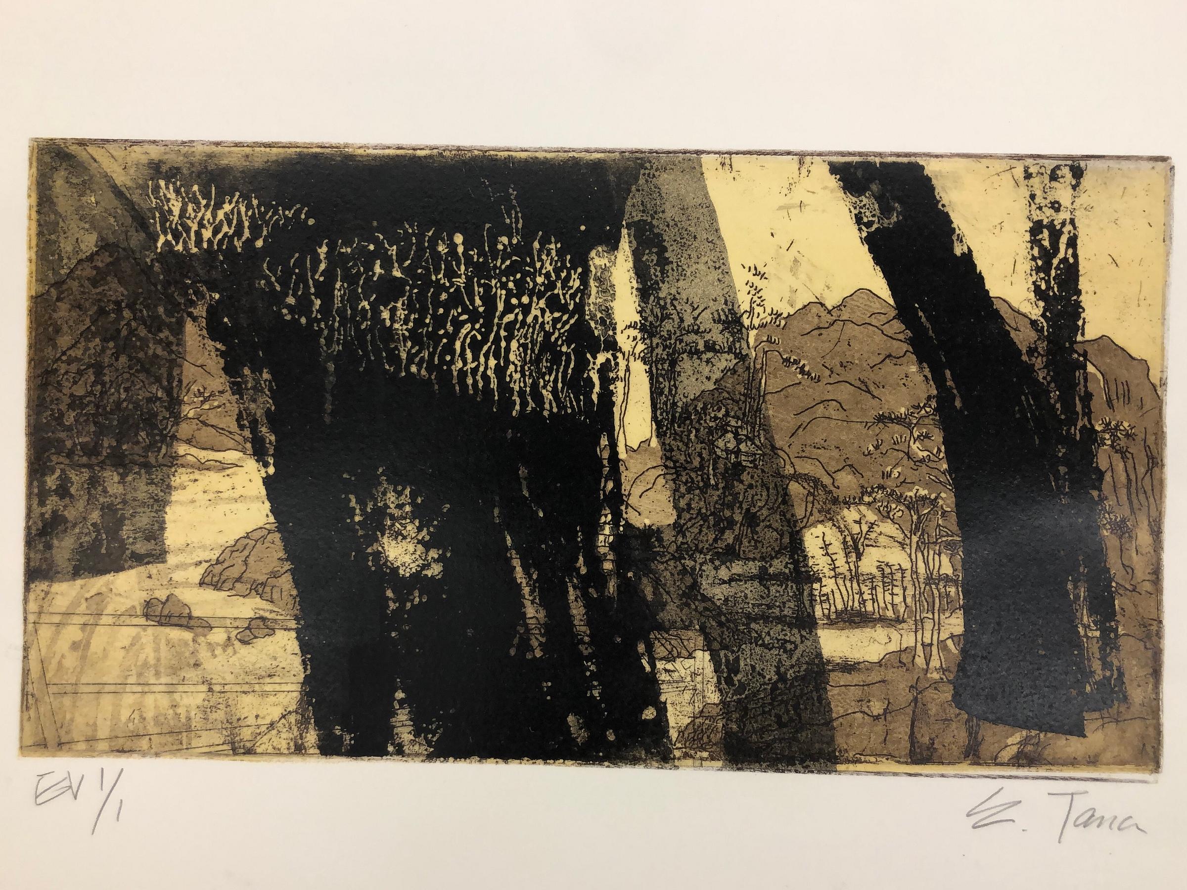Pieces that appealed to me more immediately included acrylic and beeswax paintings by Ginny Parsons (particularly “Palm Trees by Pool”) and Tony Bellaver’s platinum palladium contact print, “Spar Tree, Mt. Shasta, California” (pictured at top). Also striking were June Yokell’s oil on canvas “Central Park in New York,” and etchings by Elizabeth Tana.
