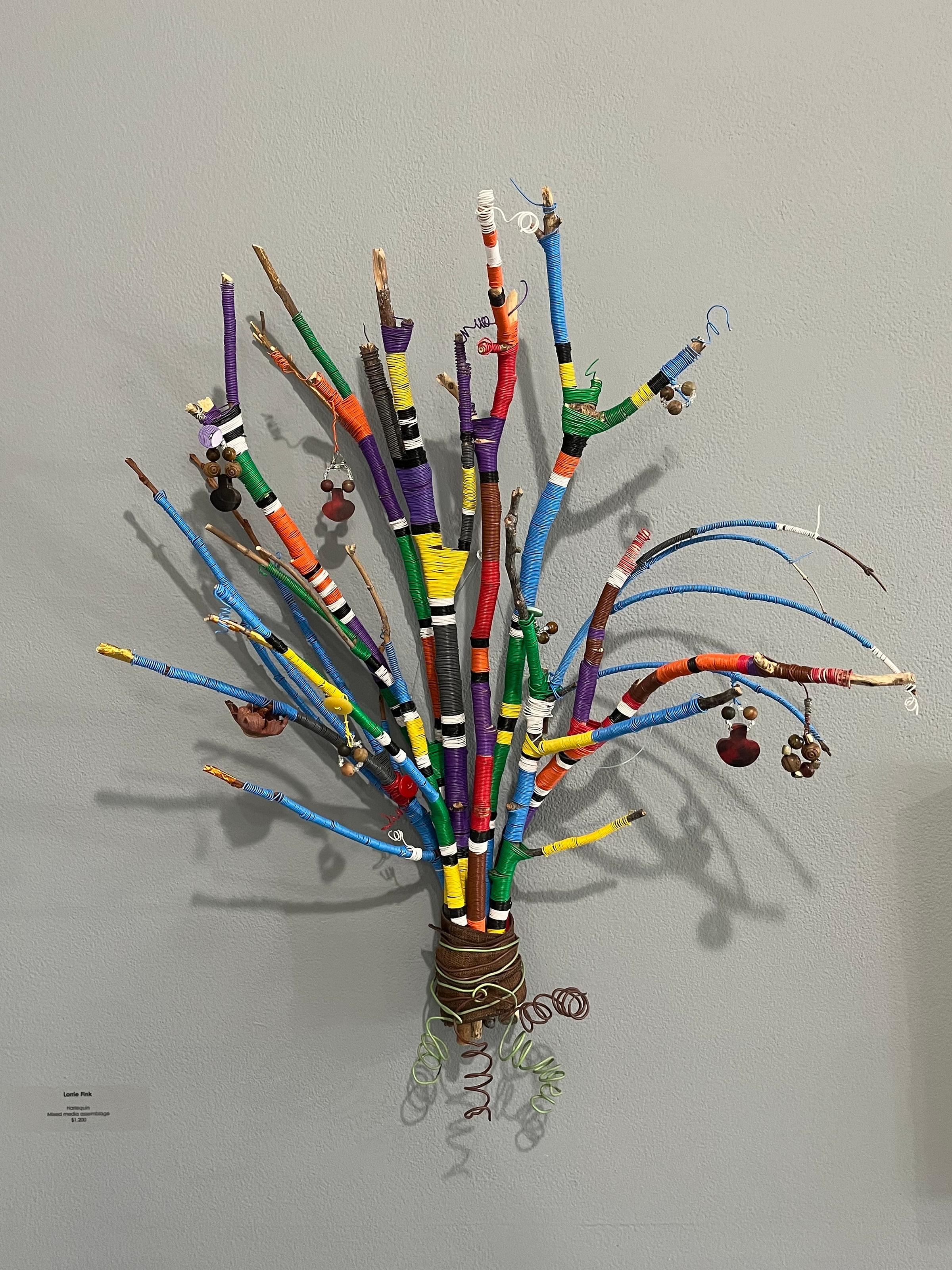 Another sculpture was by Lorrie Fink, “Harlequin.” At first I wasn’t very sanguine about the mixed media assemblage, but I kept returning to it. (It grew on me — forgive the pun.) If I go back to a piece I’m initially not into more than twice I know it possesses something that pings my deeper interest. The colorful whimsey in Fink’s work won me over.