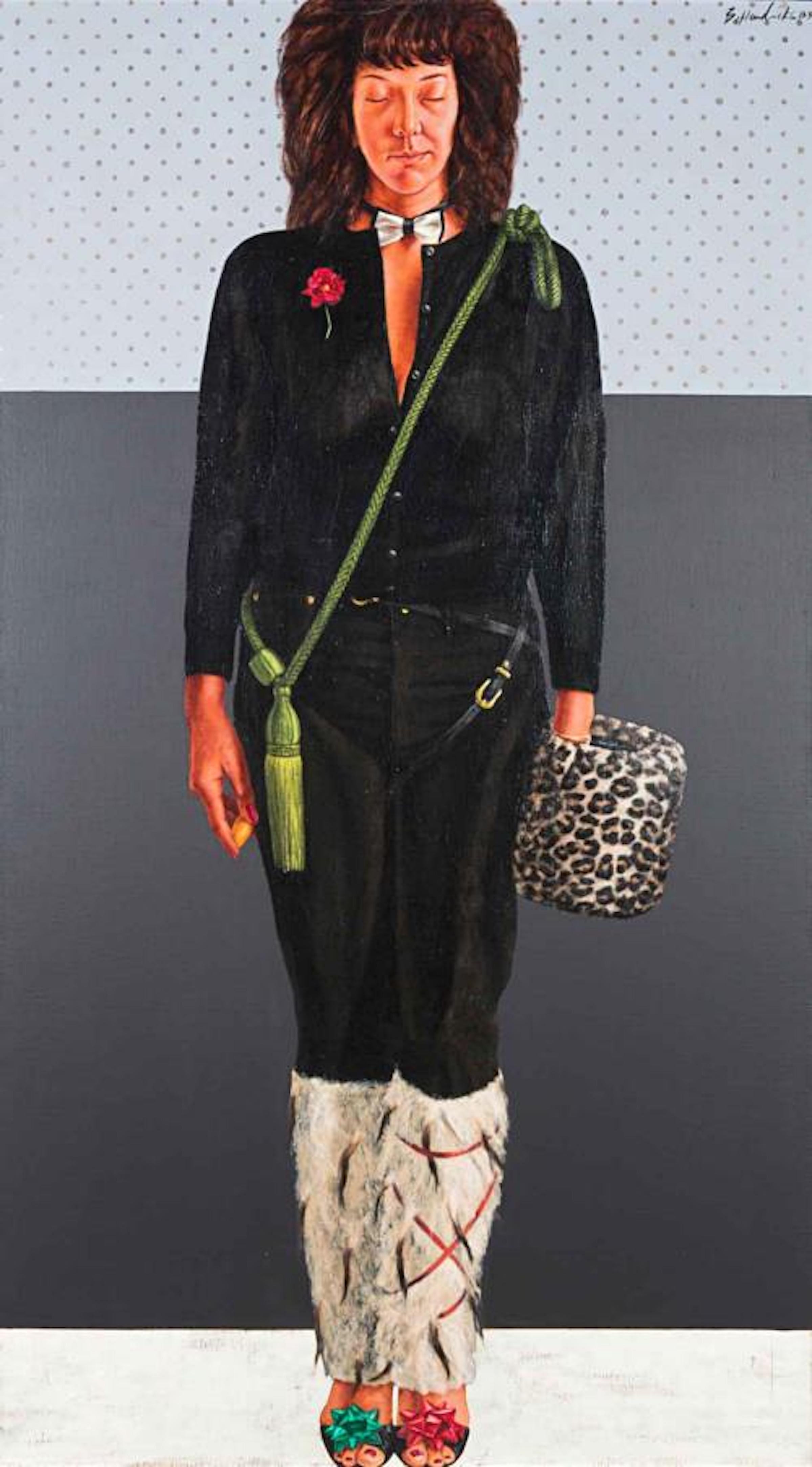 Adam: I love chaotic art and to me, this painting Ma Petite Kumquat feels chaotic. Why are there Christmas present bows on her shoes? What is that bowtie doing? Is that a lampshade in her hand?