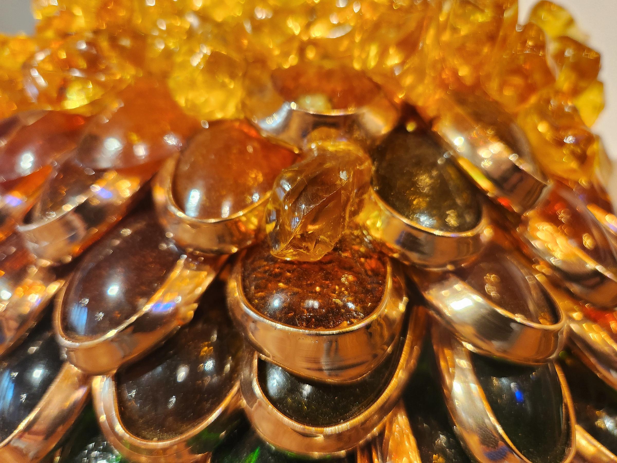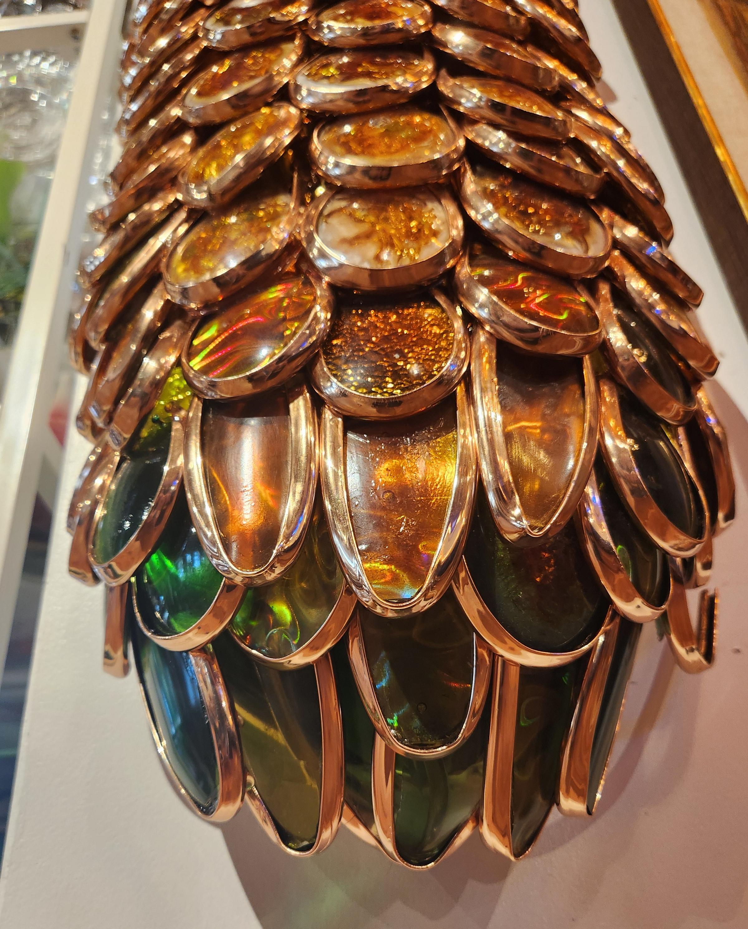 Peering closely and taking more cell phone photos than was perhaps polite, I crouched and bent and considered. The acrylic-filled panes — were they scales? Eyes? Feathers? Shingles? Something else entirely? Resinous bulbs, plastic crystals, beaded the half-mooned top, trickling into the tigers eye, opalized, mother-of-pearl lenses. A few deep sea creatures, or tide-pool urchins, peered back. Further down, clear algal green forms nestled with citrine and gold, green chartreuse and more iridescent abalone look-alikes. A few winked at me, crinkled cellophane in a shallow bath.