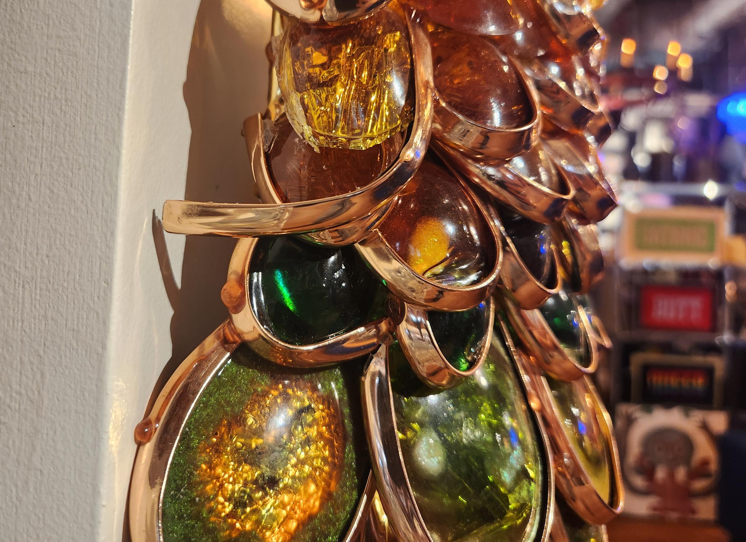 I left with many more questions than I’d expected. What were the fastenings? Were those pulled edges intentional? Was it resin? What was it dyed with? Were the panes each cast, cut, molded? What kind of glue is coating it and what does the understructure look like? The $650 price tag may be out my budget, but feels reasonable for the size and intricacy. I mean, how else do you display your love of melted poolside plastic glassware in a tasteful manner or preserve your crushed glass mancala stones?