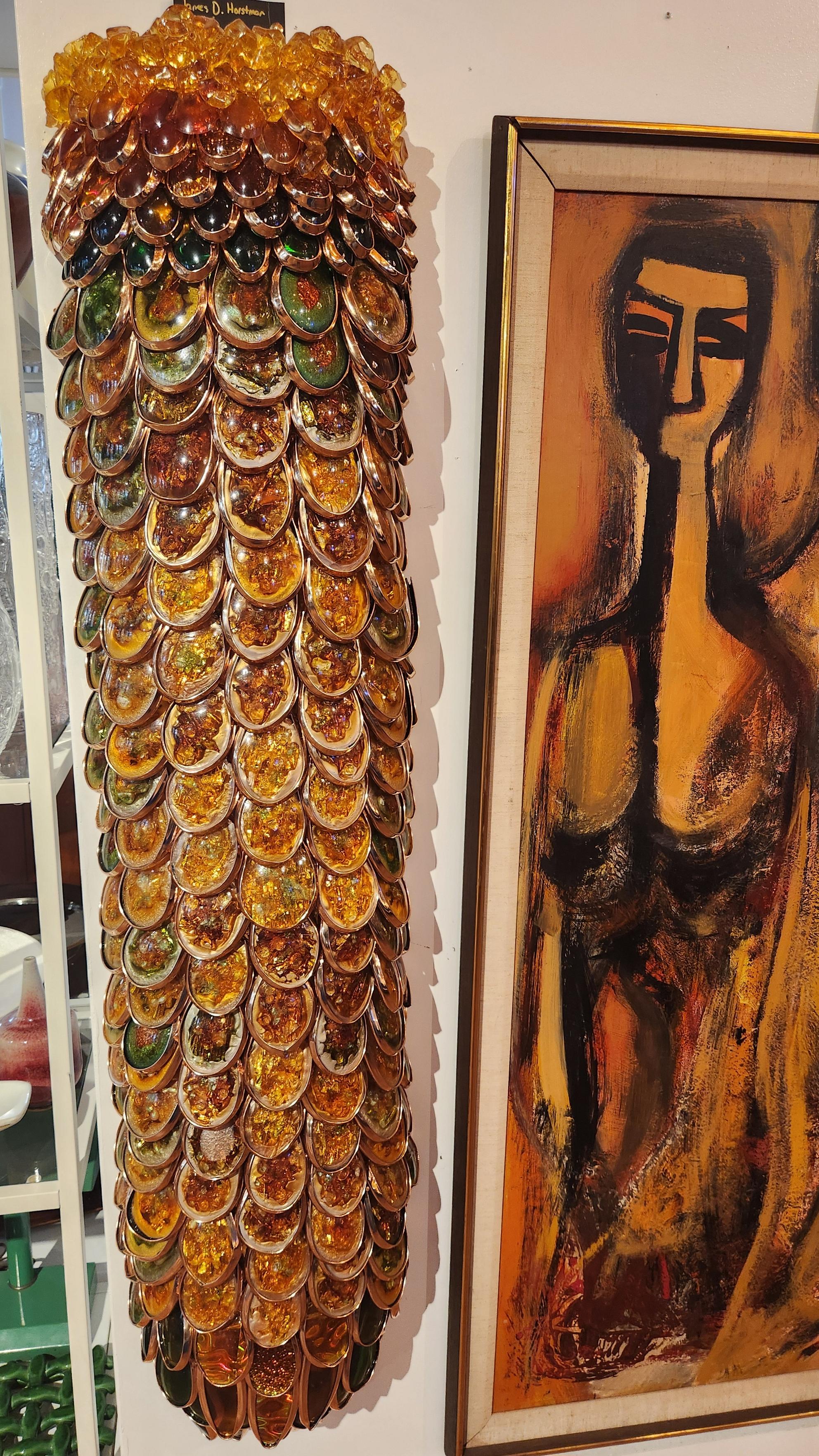 Many eyes twinkled at me, refracting their rich gemmed hues onto the wall beneath. They looked heavy together, but light individually, their frames a lustrous gold — but are they metal? I guessed not, but the simple description on the tag— “acrylic and mixed media/ wall relief” — offered few clues. I searched high and low, looking more than odd to the staff I’m sure, for the promised signature, but came up empty. A quick Google confirmed that the signature is, in fact, on the wall facing back of the hanging.