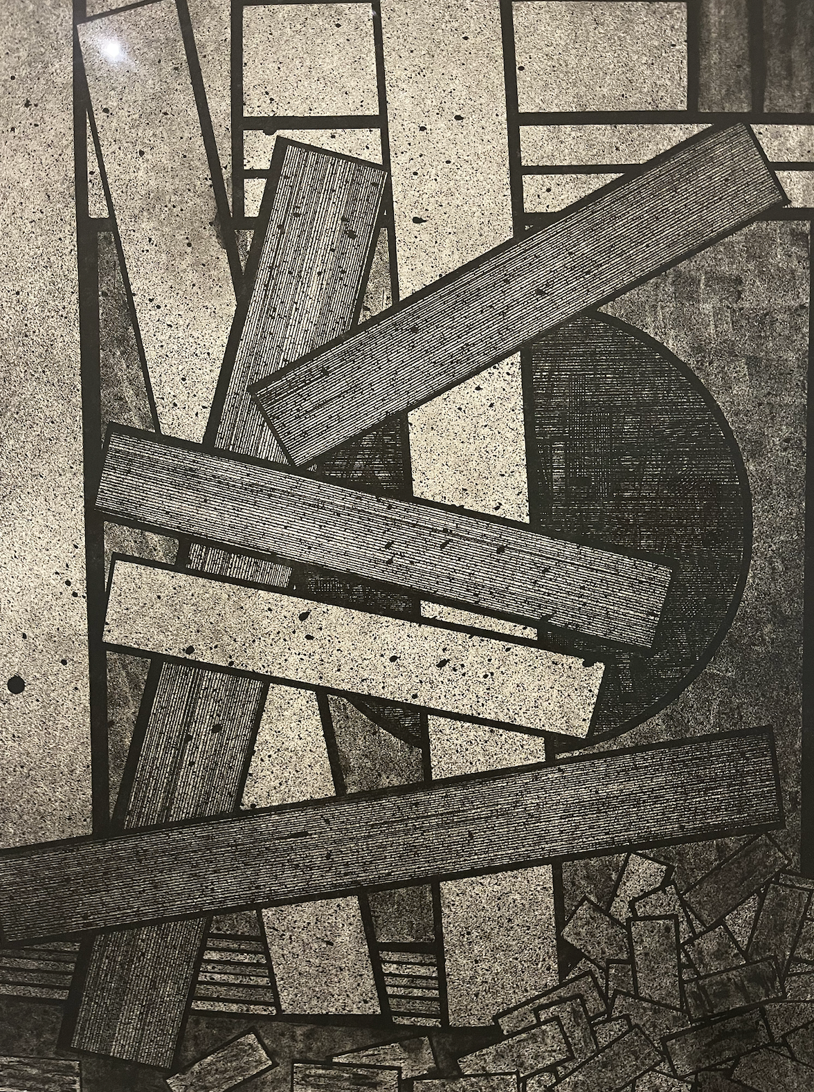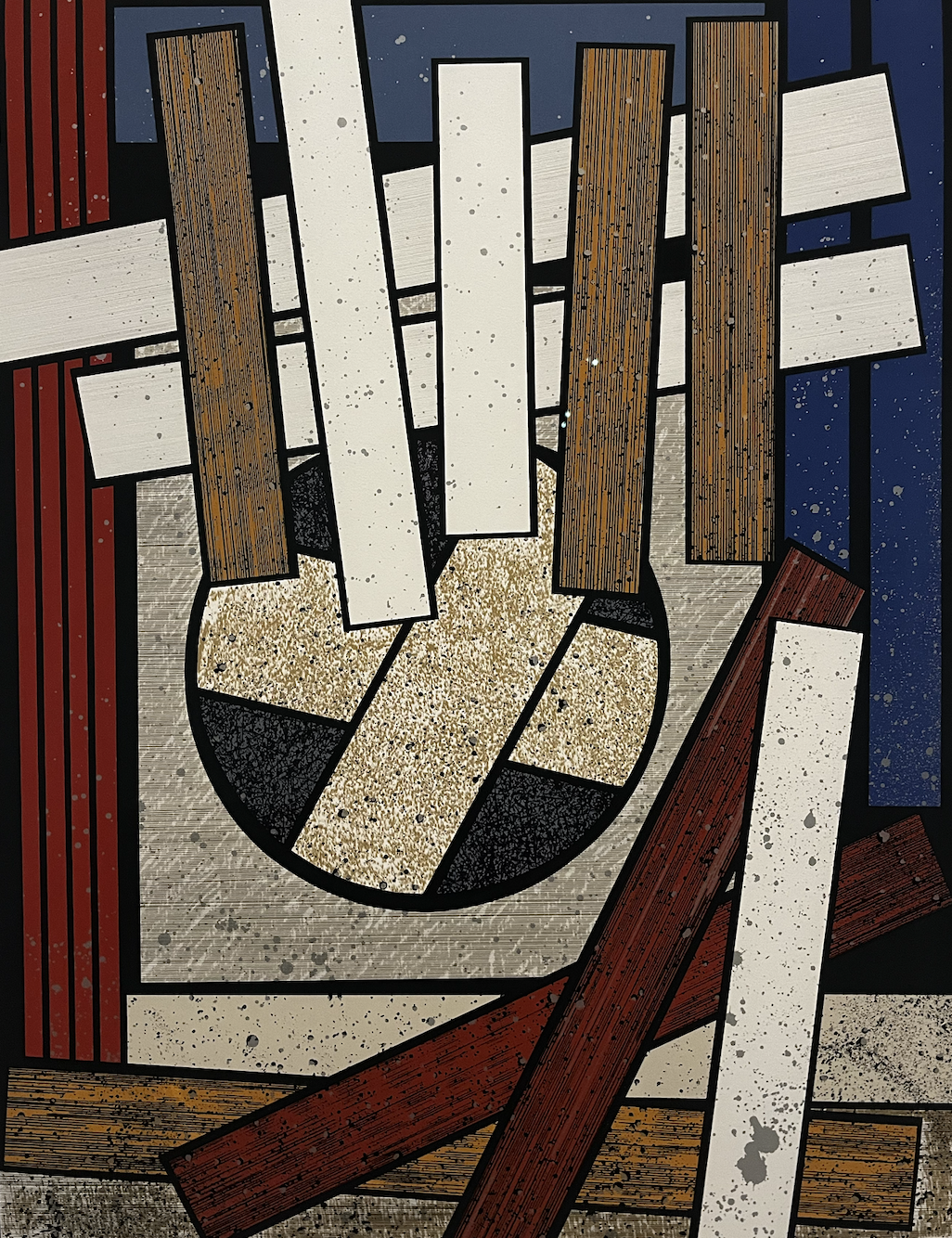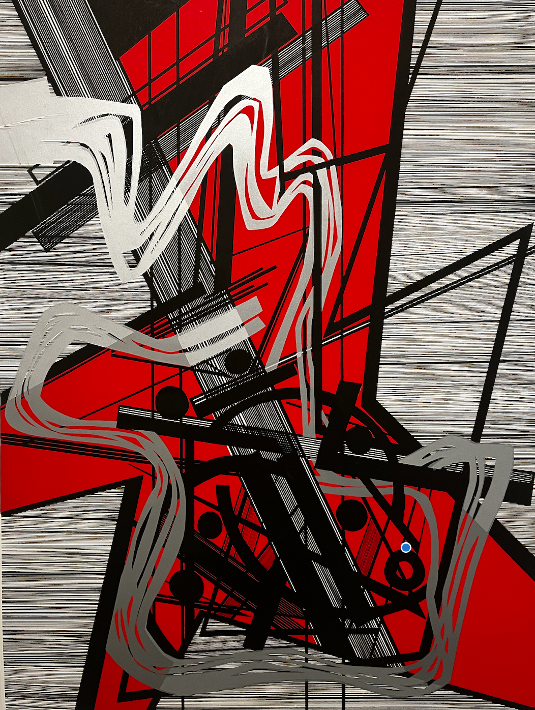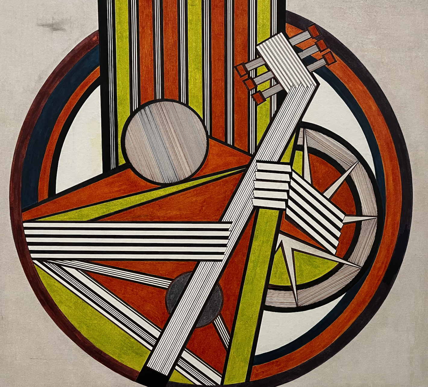This blunt abstraction evolved into more colorful and intricate representations of then-modern machinery and technology. Take, for example, an untitled ink and graphite piece resembling a vinyl cover, with yellow and white lines symbolizing a track list on the side and central circles and rectangles symbolizing the inner workings of a record player. Another work of scarlet marker called “Paris, Mai-Juin,” details the jolting power of an electric guitar, shown in silver, with the soft circular power of a banjo traced underneath.