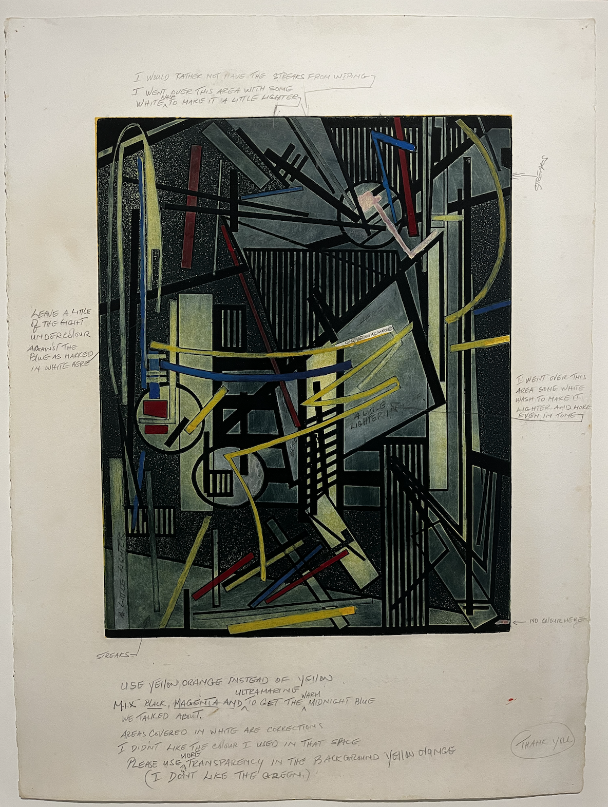 In Pusey’s world, the highs and lows of life are like x’s and o’s. The nuance in between comes through in color. Though some of her designs present the primary colorism of other abstractionists like Dutch theorist Piet Mondrian, an untitled sketch marked with Pusey’s own notes highlight her commitment to working out exact hues to use. “Mix black, magenta and ultramarine to get the warm midnight blue we talked about,” she reminds herself in a paper margin.