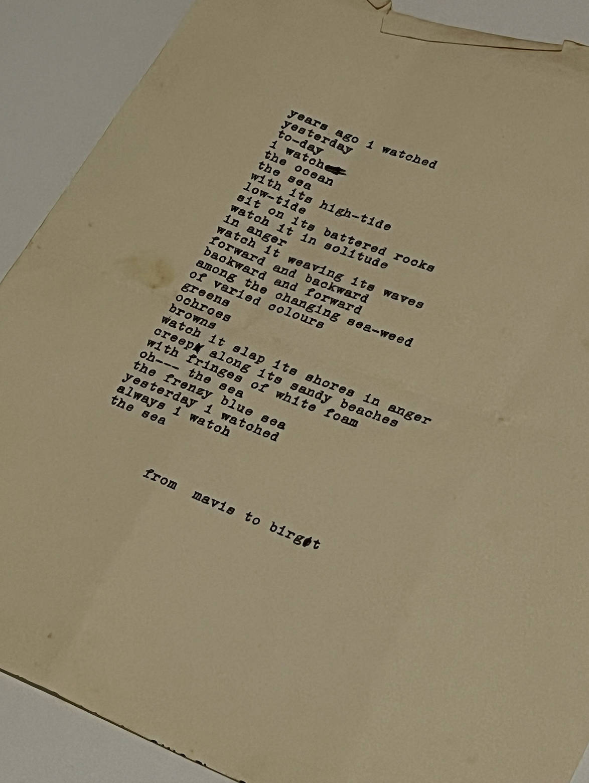 Pusey’s poetry similarly embraces the peaks and pits of time. The ICA includes a typewriter stanza from Pusey’s files: “Years ago I watched/ yesterday/ to-day/ I watch the ocean/ The sea/ With its high-tide/ Low-Tide/ Sit on its battered rocks/ Watch it in solitude/ In Anger/ Watch it weaving its waves/ Forward and backward/ Backward and forward/ Among the changing sea-weed/ Of varied colours/ Greens/ Ochroes/ Browns/ Watch it slap its shores in anger/ Creep along its sandy beaches/ with fringes of white foam/ oh— the sea/ the frenzy blue sea/ Yesterday I watch/ Always I watch/ The sea.”