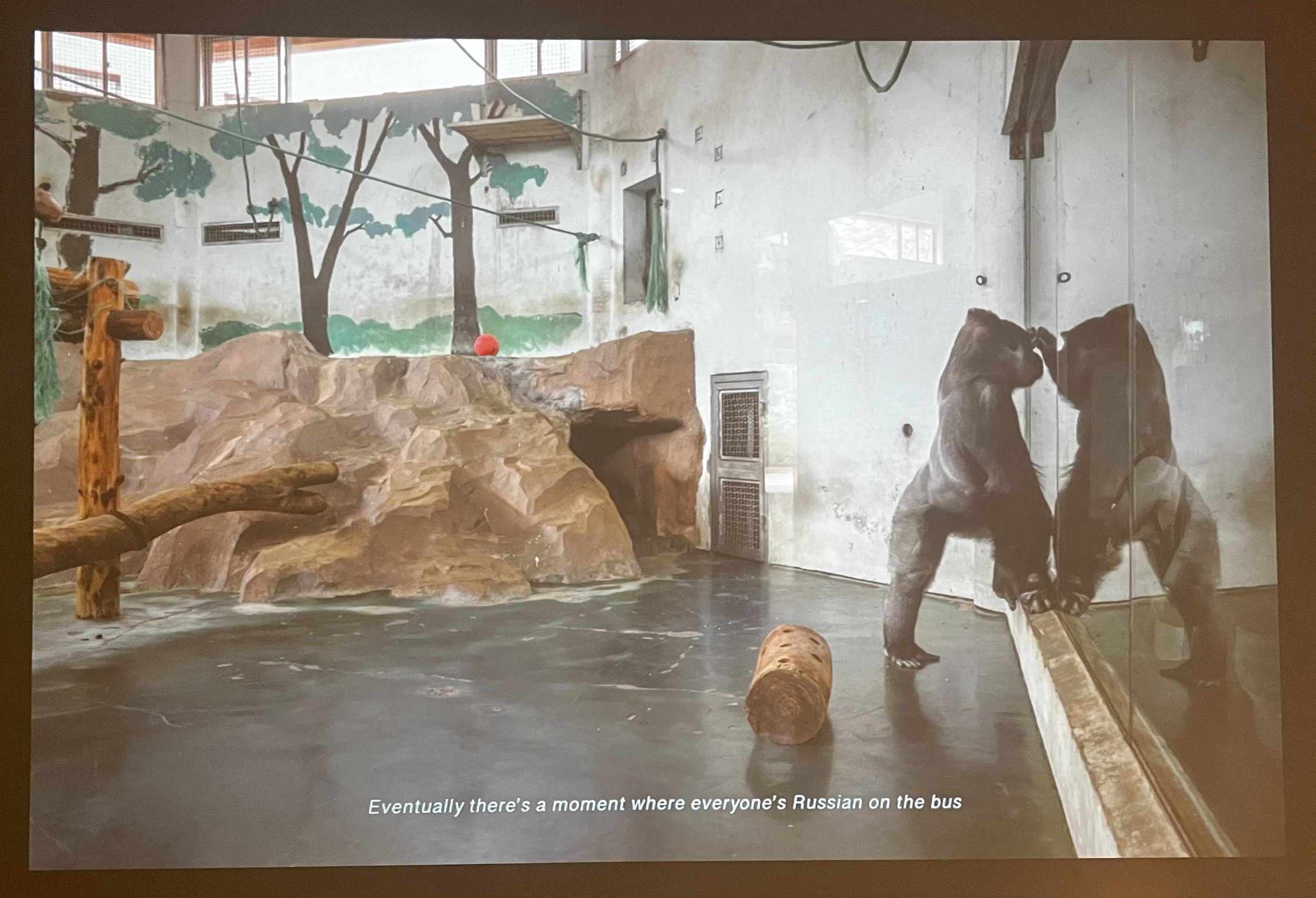 The antidote to shitty attention spans is, unfortunately, not the slide deck. The projector erases some of the natural saturation of Li’s photos, reducing their impact. The side-by-side poem, which ostensibly seeks to tie the wide-range of images together, is also a distraction — though I will say some gorgeous lines stand out on their own terms, like “You are like a needle in my clock; but now you are here, a breathing body.” The laggy pacing undermines generative reaction from viewers.