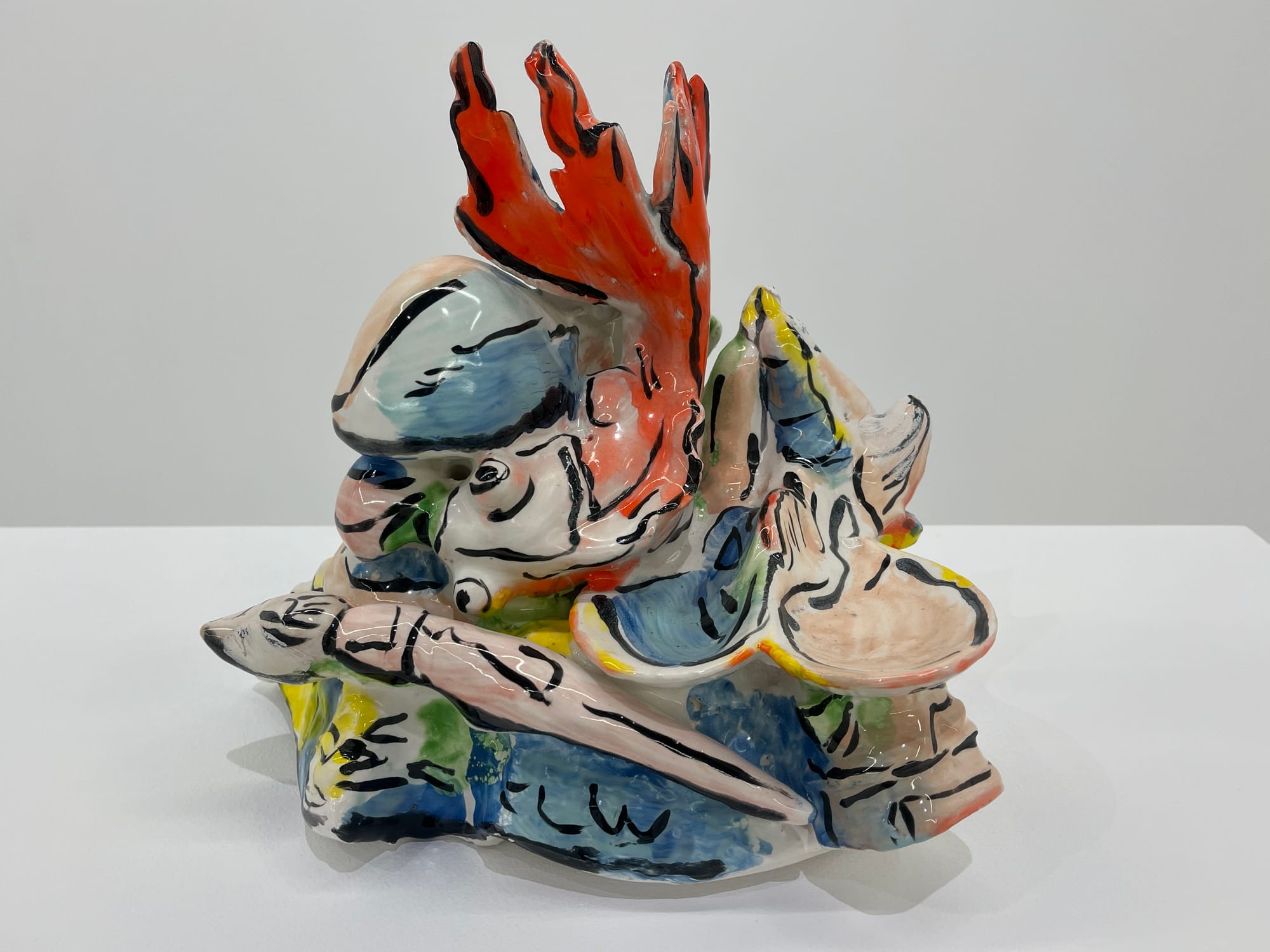 Farther inside, Frey’s smaller sculptures are set widely apart on display tables and hung on walls. I immediately gravitated towards “Untitled (Bricolage with Goldfish and Paintbrush)”: a lovely, delicate slipcast sculpture featuring the melding of so many perfectly wrought shapes and colors I couldn’t help but wonder at how Frey had fashioned it before it had been glazed and fired. Her internal vision for the finished work was apparent, as was her skill in realizing its execution by its subtle yet motion-full glazes. It seemed something almost alive.
