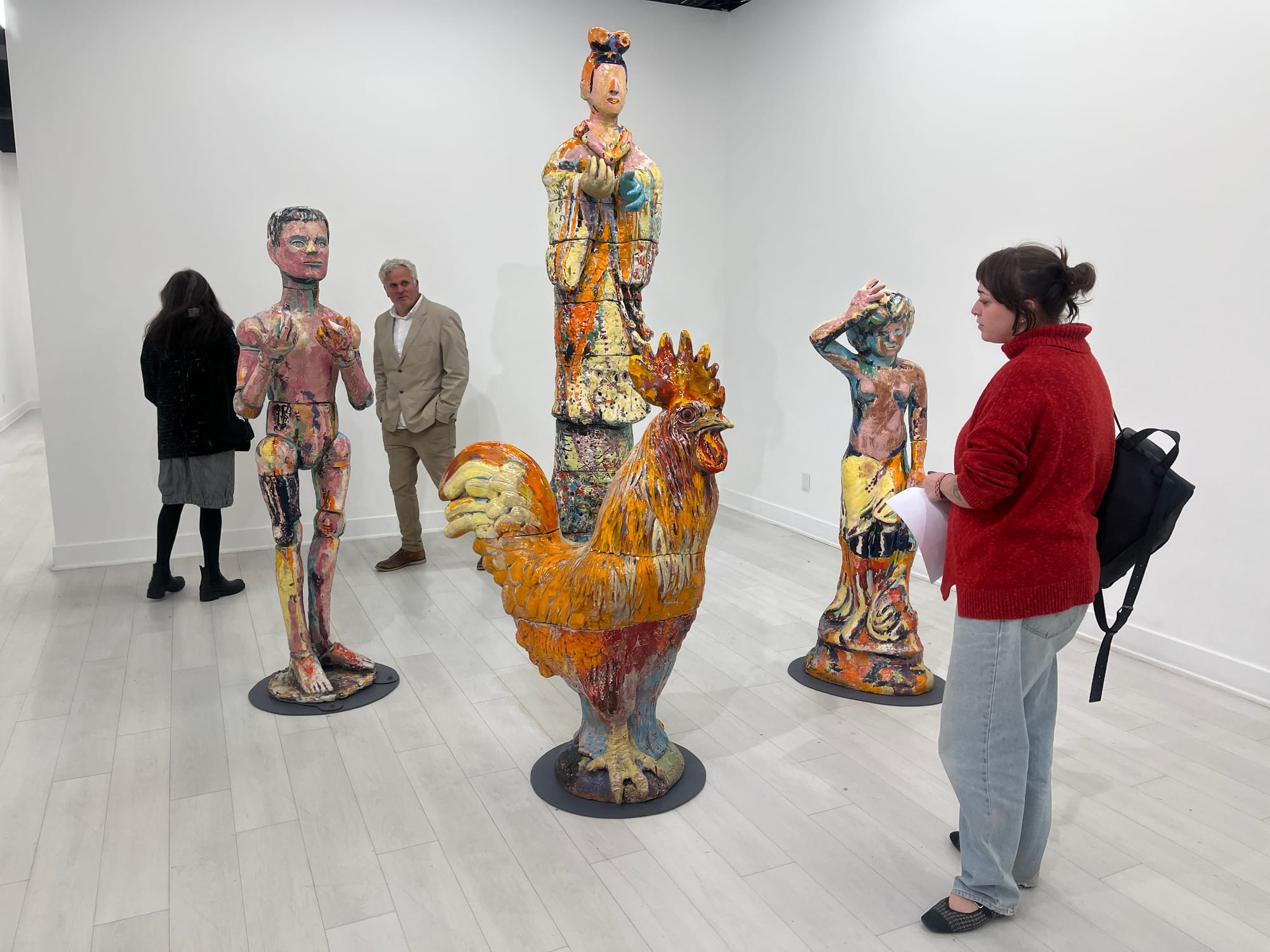 The brilliantly lit front room of the gallery is anchored by “China Goddess Group,” a collection of four huge ceramic sculptures from 1979-1981. The pieces are of a male figure holding a cigarette, a female with a hand to her brow, a beautifully rendered rooster, and a robed matron figure who towers above the others at nearly ten feet tall. All are glazed colorfully in shades of orange, yellow, ochre, and muddy purples and blues. Despite their vividness, the figures are somber and serious, imbuing the gallery with a solemn aura, a remarkable feat given the space’s starkness and bright lighting. One almost feels as if they’re guardians of a sacred shrine. I lingered there for a long while, surprised by the fact that visitors were allowed to walk in and around the pieces without some kind of barrier in place to protect them.