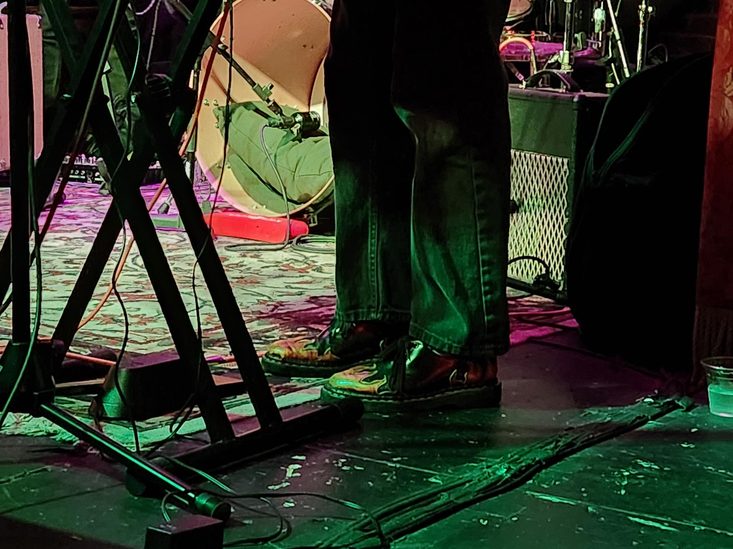 As Sunshine stood behind a keyboard sporting an open button down shirt, flaming Doc Martens, and the aforementioned tarot guitar strap, the getup was in line with queer Gen Z fashions.