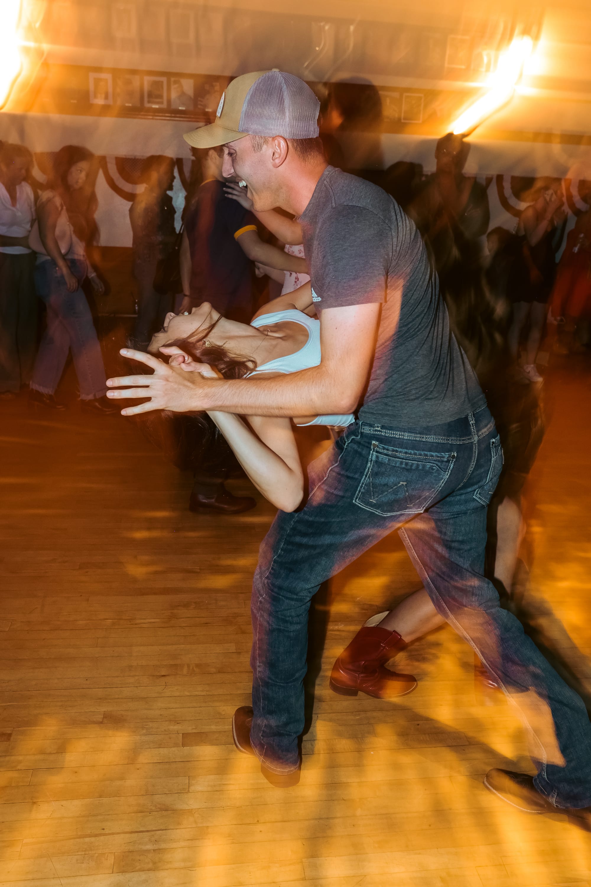 The Texas Two Step, colloquially known as “Two Step,” is a product of America’s hopefully-not-withdrawn melting pot promise. An amalgamation of European and Mexican folk dances, it evolved organically in juke joints and rural bars (as opposed to the square dancing Henry Ford pushed into schools as a nationalist “Anglo” identity play), and achieved “template” status around the early 1980s, with myriad flourishes added since then. That authentic spirit and exchange of energies was present throughout the evening, with all manner of different takes—fast and spinning, slow and swinging, parallel and in unison—manifesting before the Old Glory bunting on the stage.
