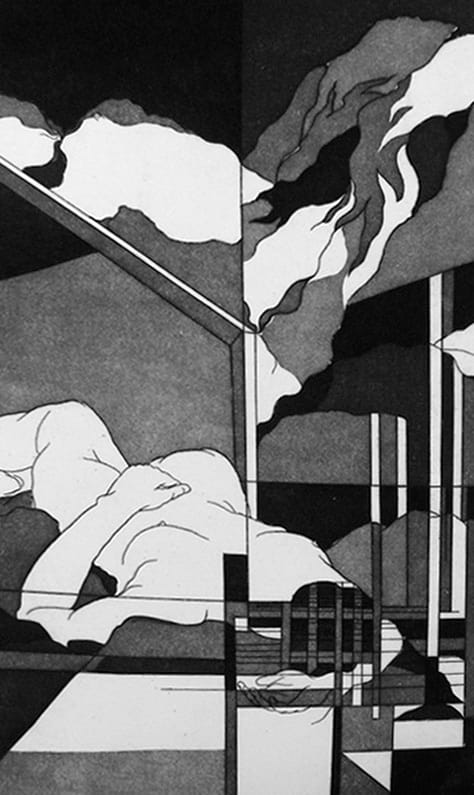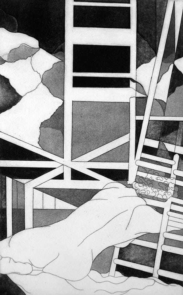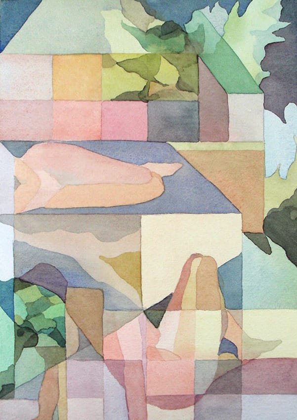 These early 1980s watercolors and etched prints boast warm and watery undulating waves of color in the first and clean, clear, high-contrast black and white lines in the second. Nude figures recline, indoors and out, architectural lines giving way to home decor, to mountainous features, the sky. Their ambiguity, layers, and intersections melt and diverge, gridded and agrarian. I needed the deep saturated blacks of the ink and loose, soft waves of the watercolors, but perhaps Golder’s current pencil pieces will melt your mind instead.