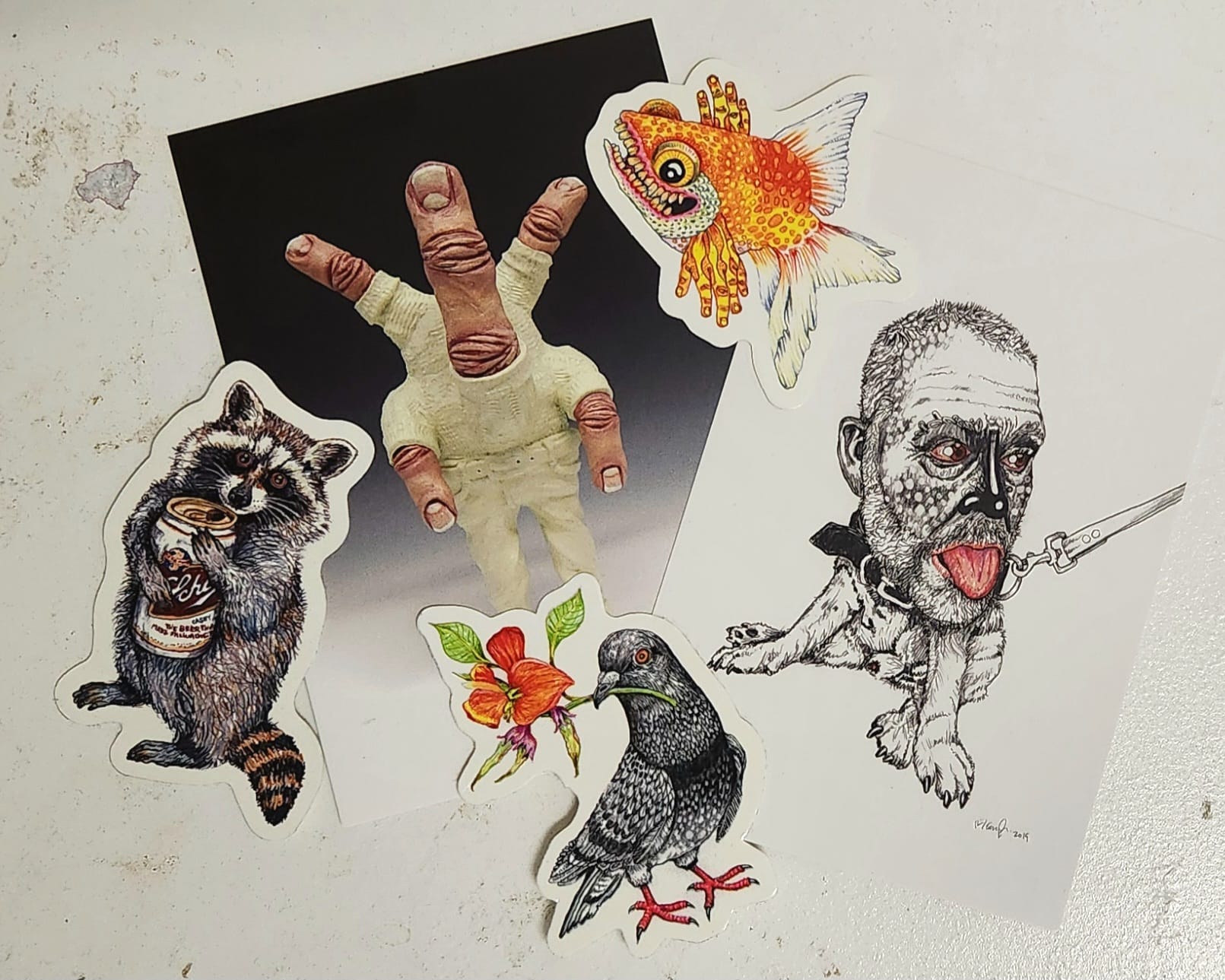A pigeon (“Pea(ce) Pigeon”, 2022), winged rat of the city, holds a vibrant orange nasturtium in beak, delicately, inquisitive. A more orange fish (detail of “Golden Girls”, 2023), swimming with hands in place of fins, grins, leers, yellow chompers dulled and crooked. A postcard of Casey, entitled “Woof (Selfie),” with the artist’s collared and spotted head, beard neat and nose shining, sitting atop a splayed small dog’s body. A pink tongue and rocket tip, eyes and leash leading out of frame.